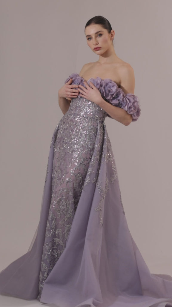 Lilac Off-Shoulder 3D Floral Embellished Gown
