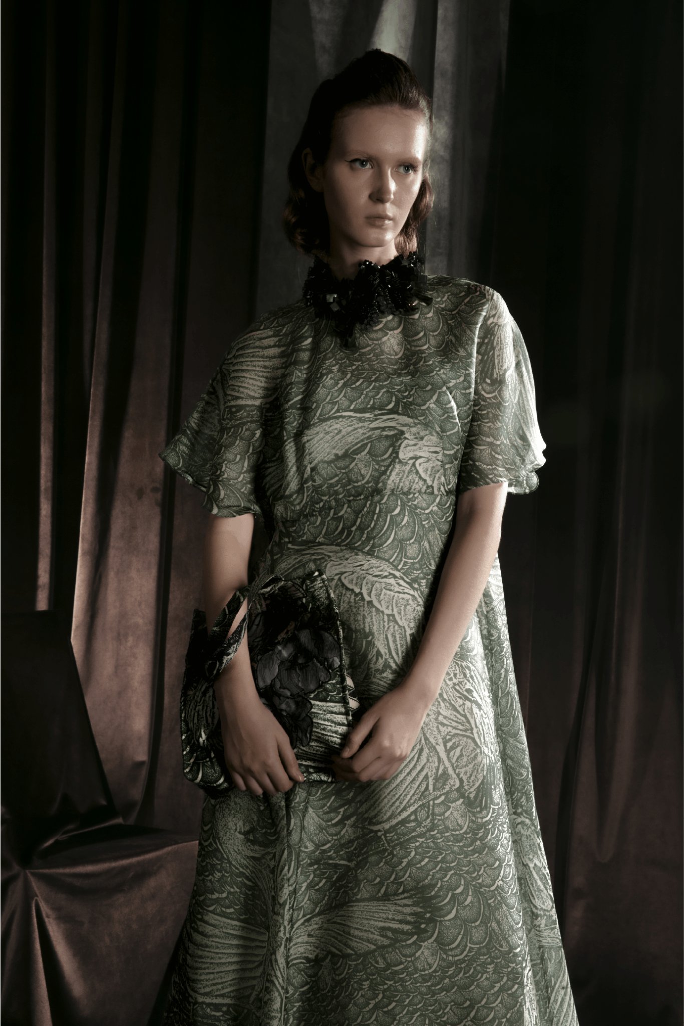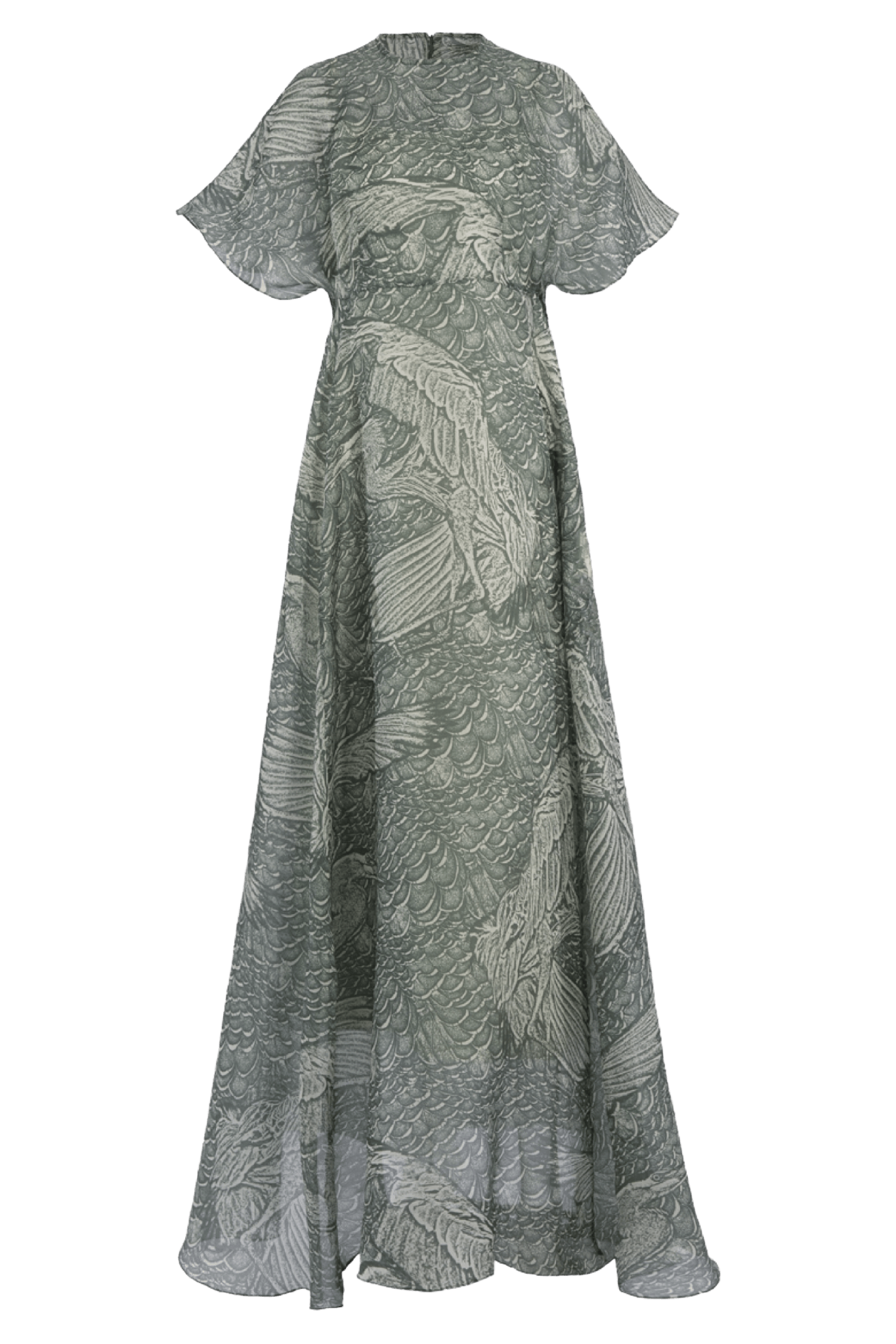 The Biyan Isaya Dress is a masterpiece of artisanal craftsmanship, featuring an ethereal sage-green palette and intricate bird-inspired jacquard motifs that elevate its timeless elegance. Designed with soft flutter sleeves and a fluid A-line silhouette, this gown drapes effortlessly, creating graceful movement with every step. Its lightweight, semi-sheer fabrication adds a romantic, airy feel—perfect for formal events, artful evenings, or modern occasions where understated luxury is desired. Discover refined couture detailing and signature Biyan artistry in a gown that feels both poetic and effortlessly sophisticated.