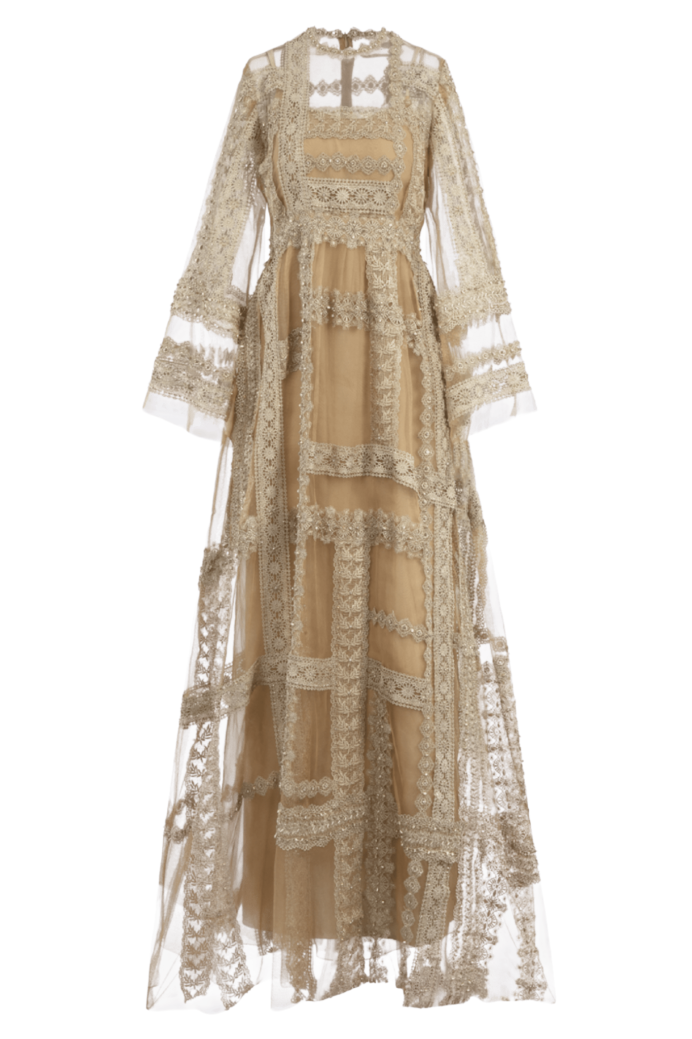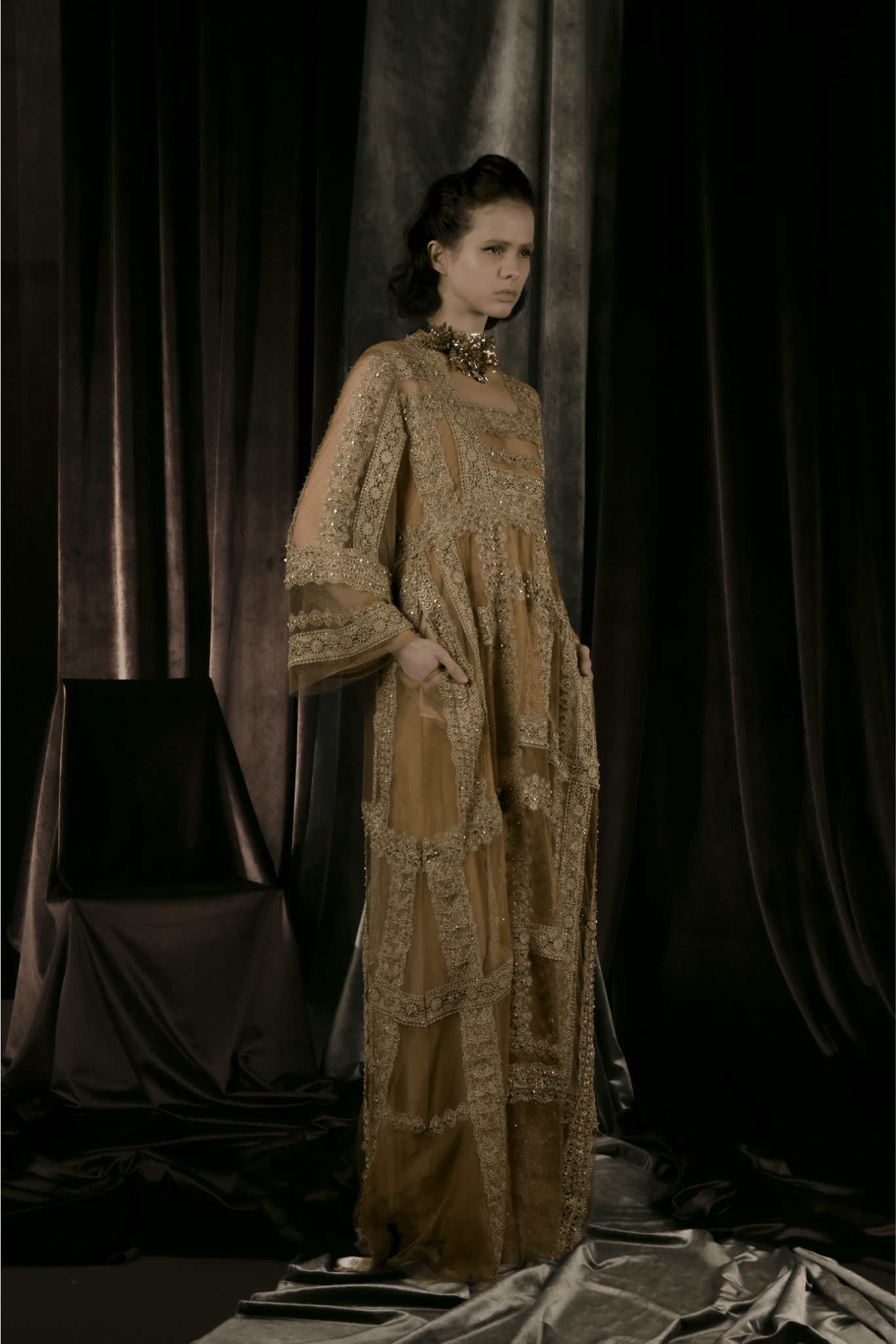 This ethereal gown is crafted from delicate sheer tulle layered over a soft nude base, intricately adorned with ornate lace panels and fine embellishments throughout. Featuring a high neckline, long flared sleeves, and a flowing floor-length silhouette, the dress balances vintage romance with refined elegance. The detailed lacework creates texture and depth, while the lightweight construction allows for graceful movement, making it an exquisite choice for formal evenings, special occasions, or elevated celebrations.