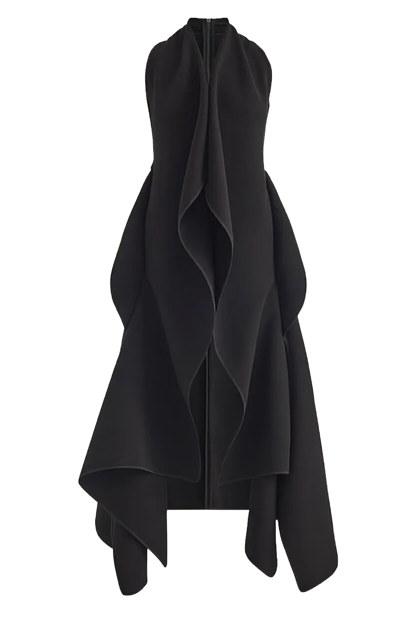 This exquisitely crafted black dress commands attention. The dramatic ruffles and asymmetrical design create a silhouette that's both modern and timeless. Perfect for a special occasion or a night out where you want to make a statement. Indulge in unparalleled elegance.