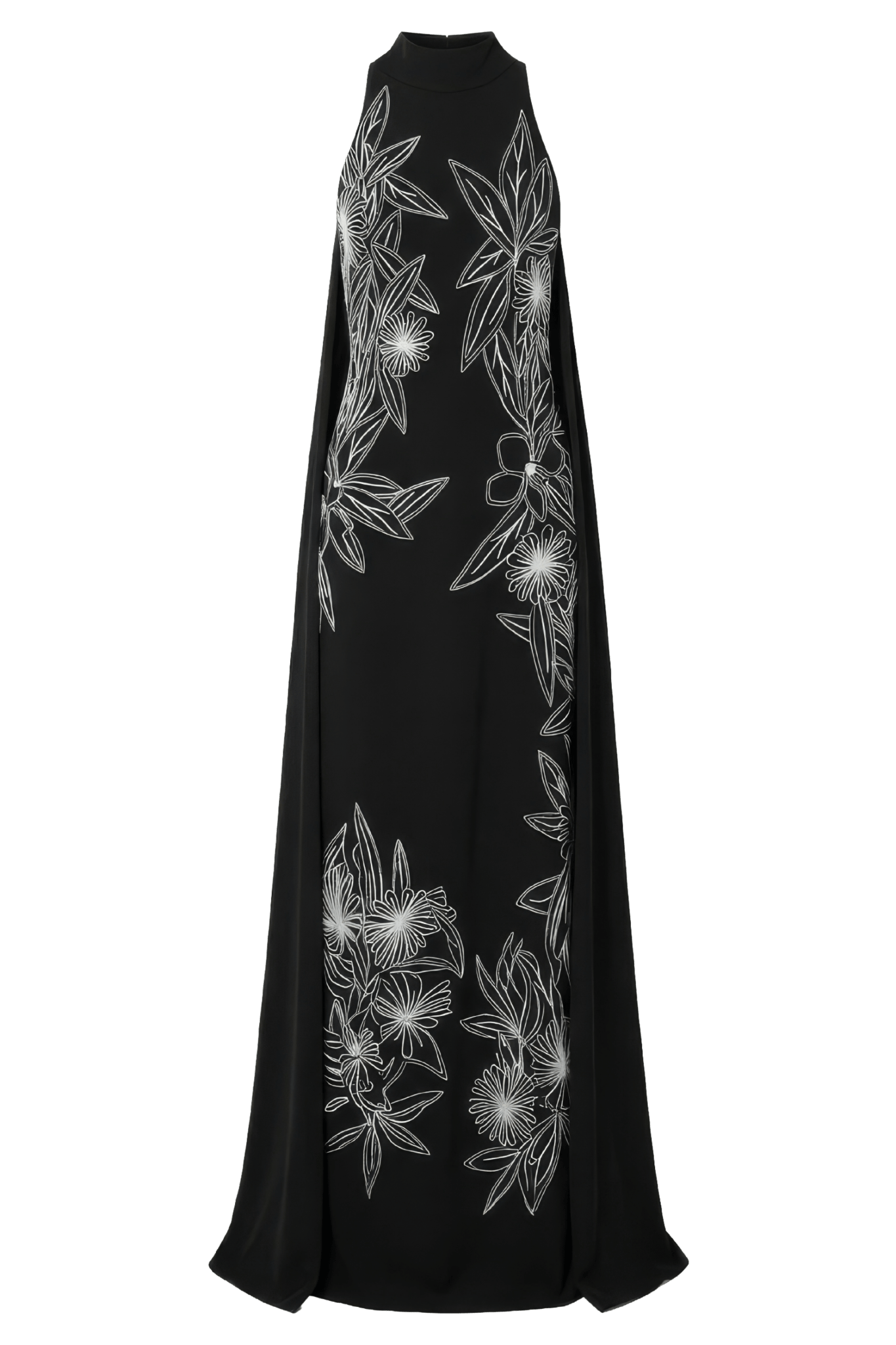 Designed with a clean high neckline and a fluid column silhouette, the gown balances architectural simplicity with artisanal detailing. The contrast embroidery adds depth and movement, creating a striking visual statement while maintaining a timeless, sophisticated appeal.