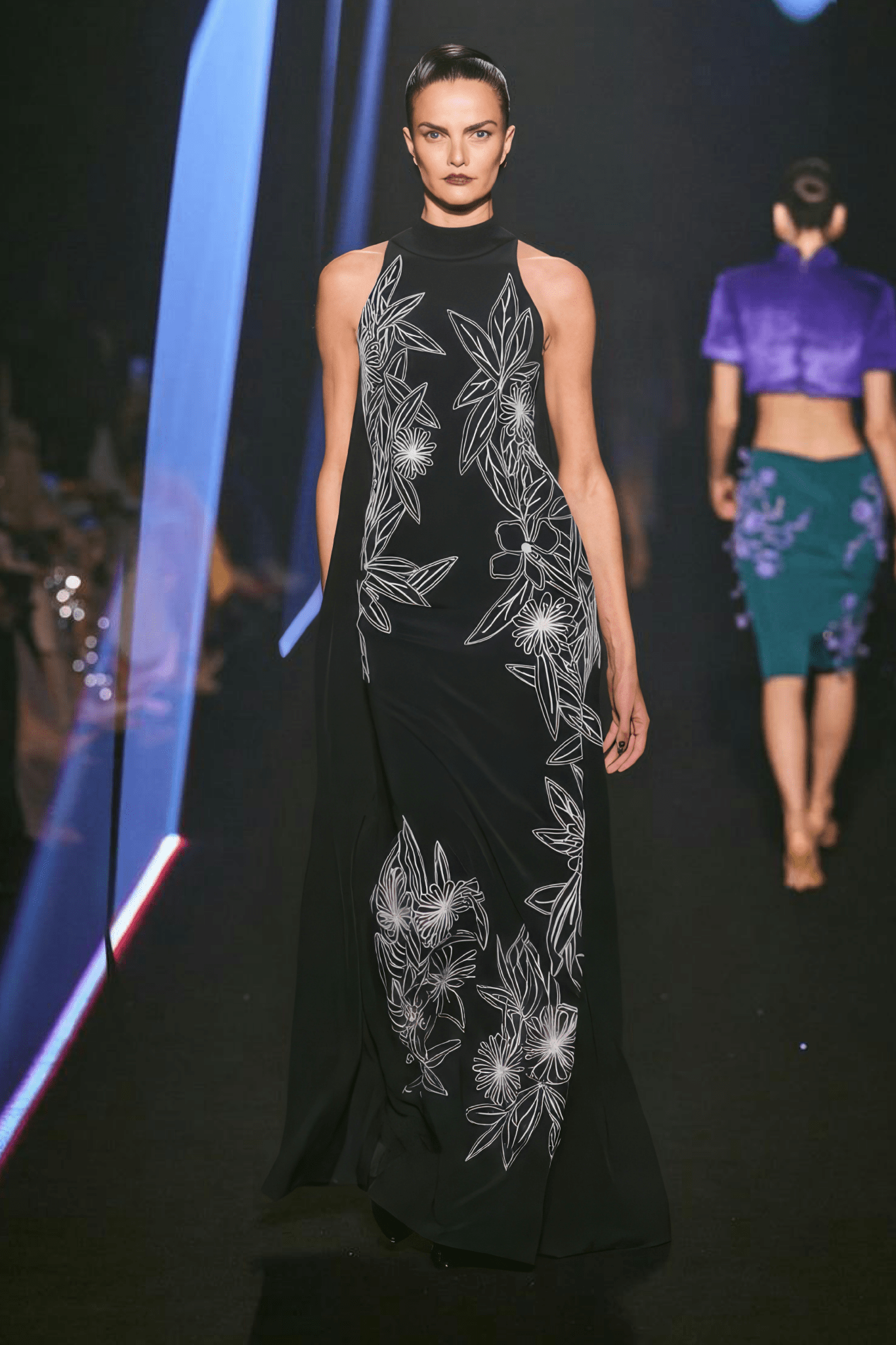 An exercise in refined modern glamour, this Georges Hobeika evening gown is crafted in classic black with intricate white botanical embroidery that traces the body in an elegant, elongating composition.