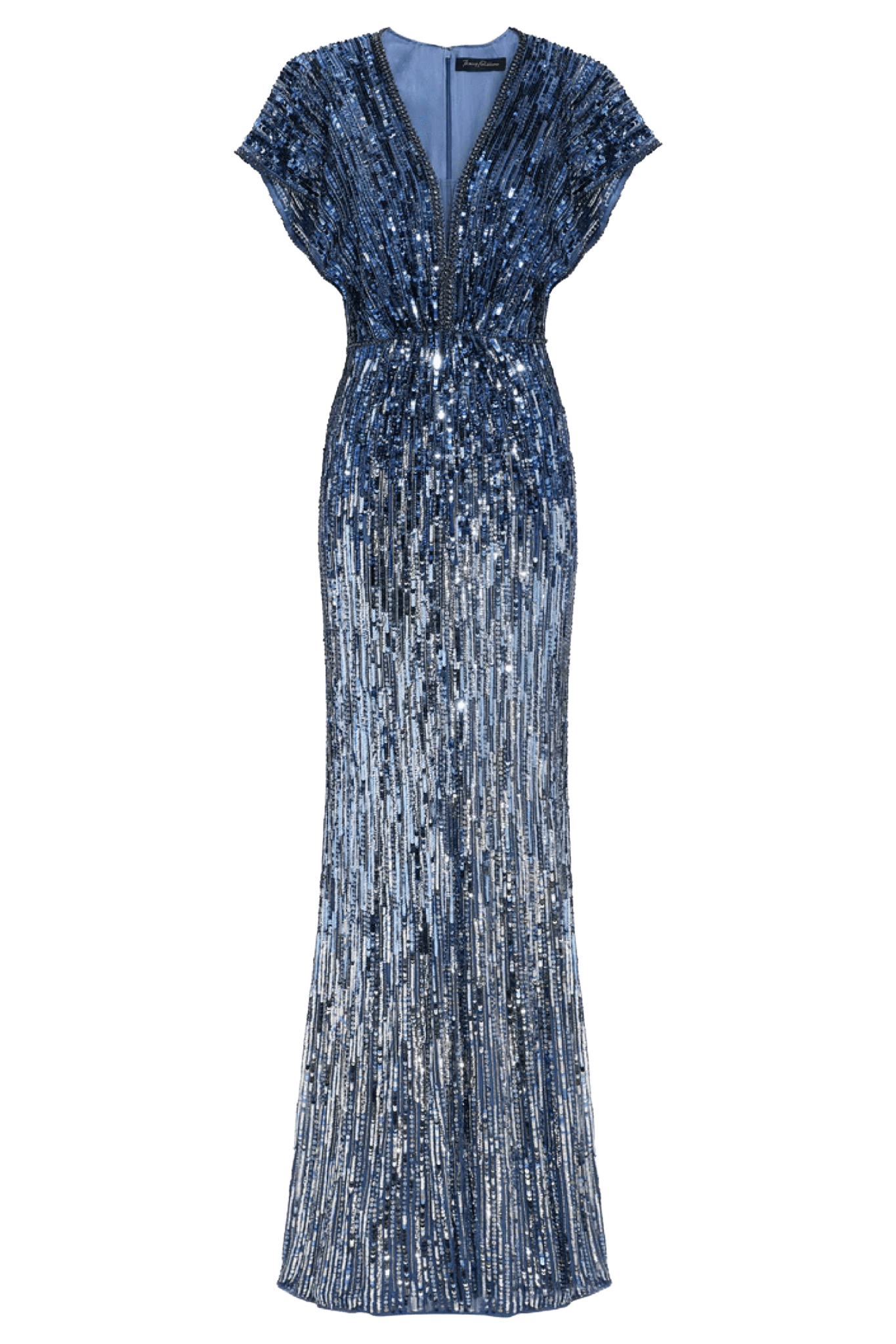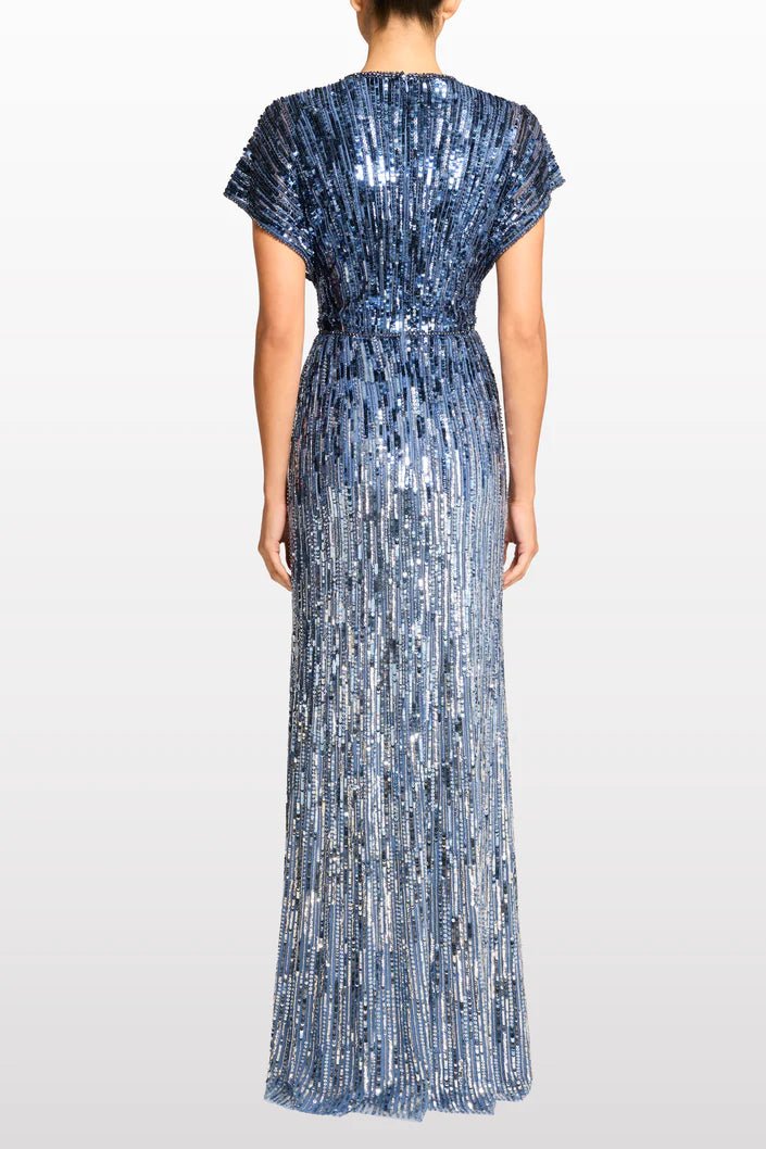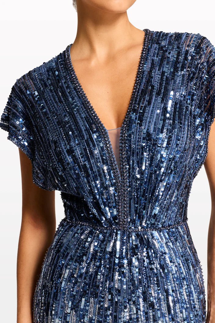 Drenched in sequins, this high-impact sparkle gown is effortless elegance with the deep V neckline and soft cap sleeves framing the décolletage beautifully, while sequins and beads cascade in linear patterns that catch the light with every step. The gently gathered waist enhances the silhouette, flowing into a sleek column skirt designed to move with fluid grace. A radiant choice for occasions that call for modern glamour and timeless sophistication.