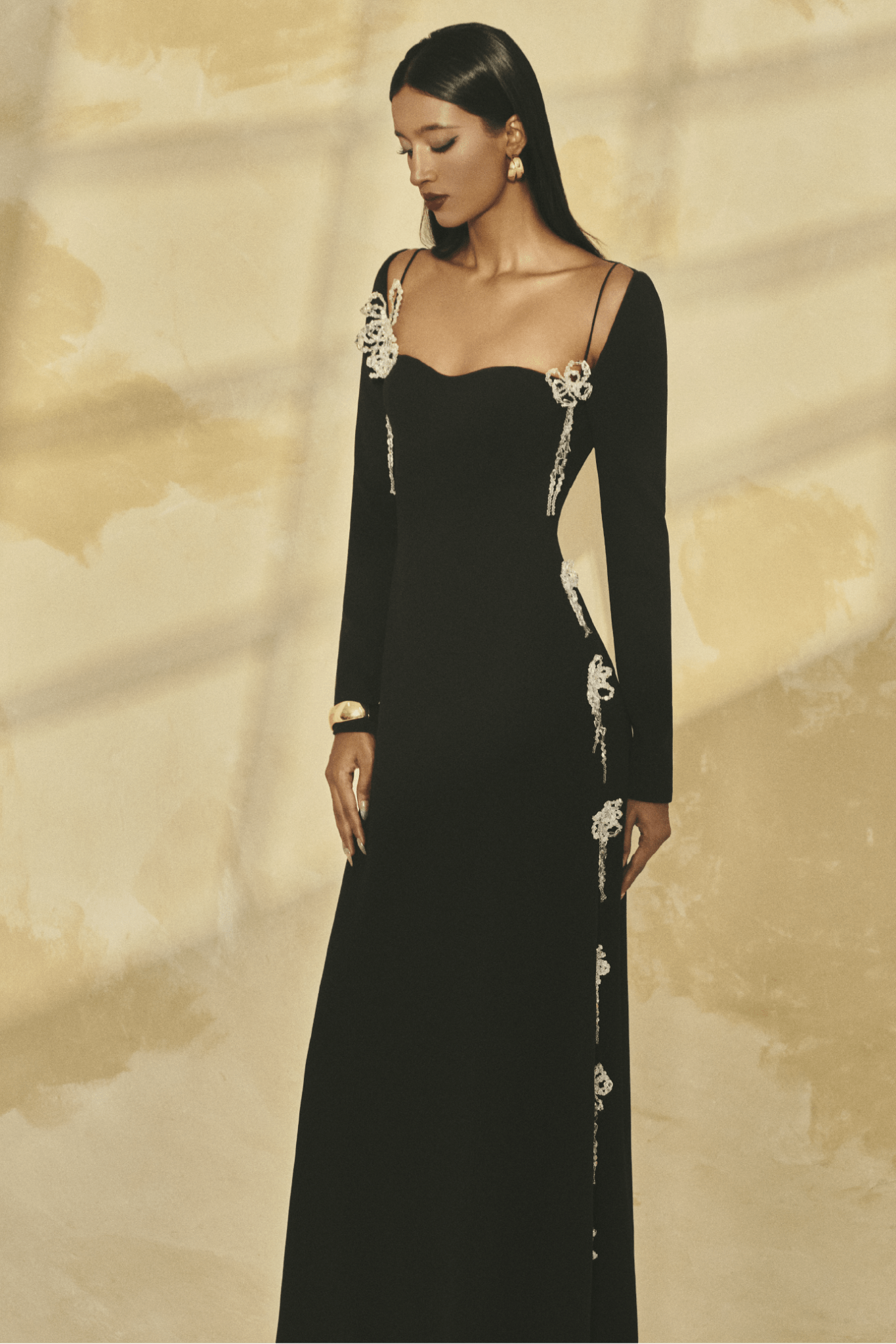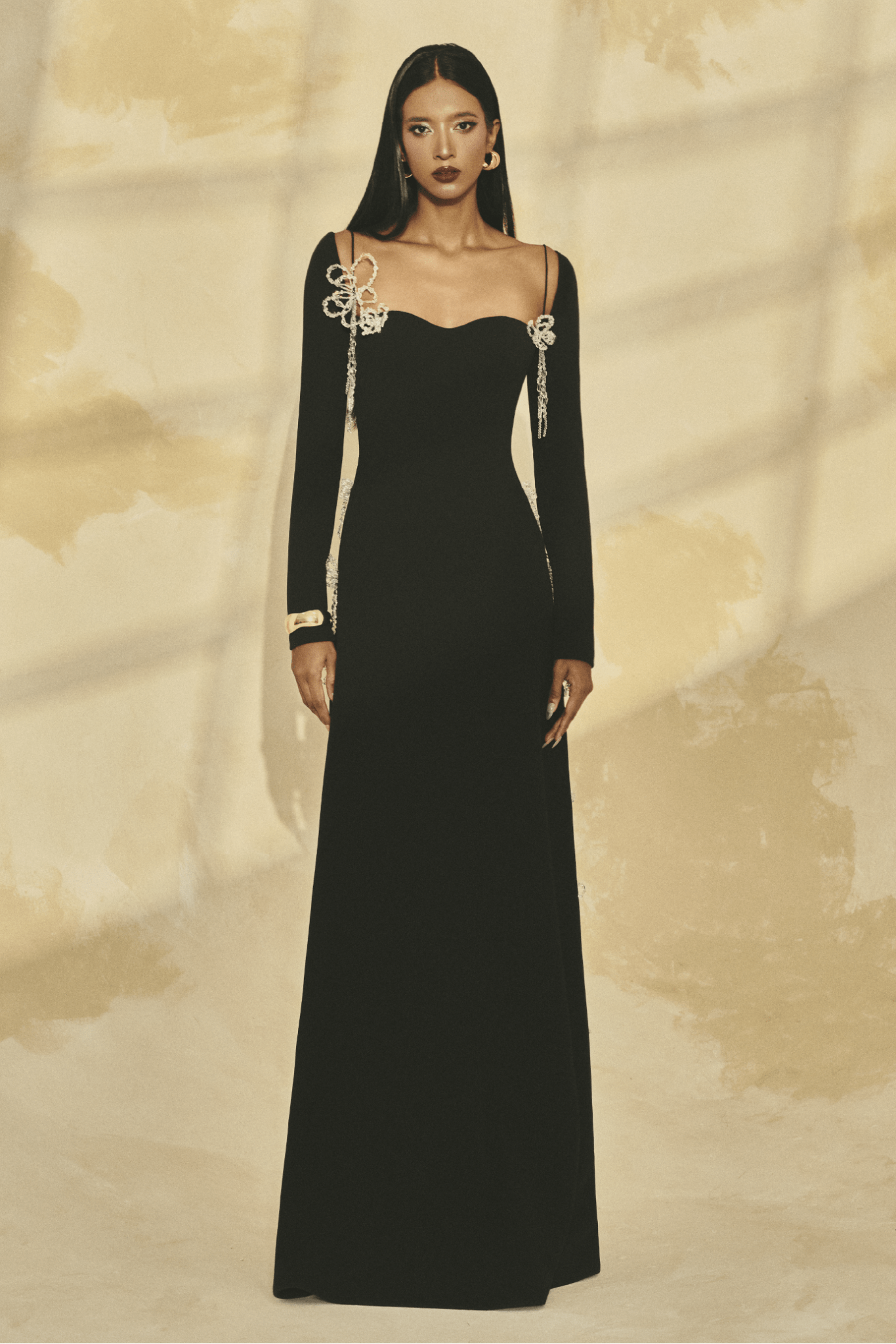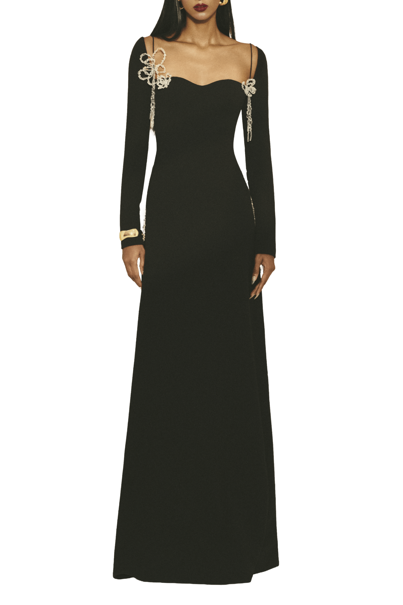 A sleek black column gown with long sleeves and delicate crystal embellishment at the neckline and shoulders. Defined by clean lines and a sculpted silhouette.