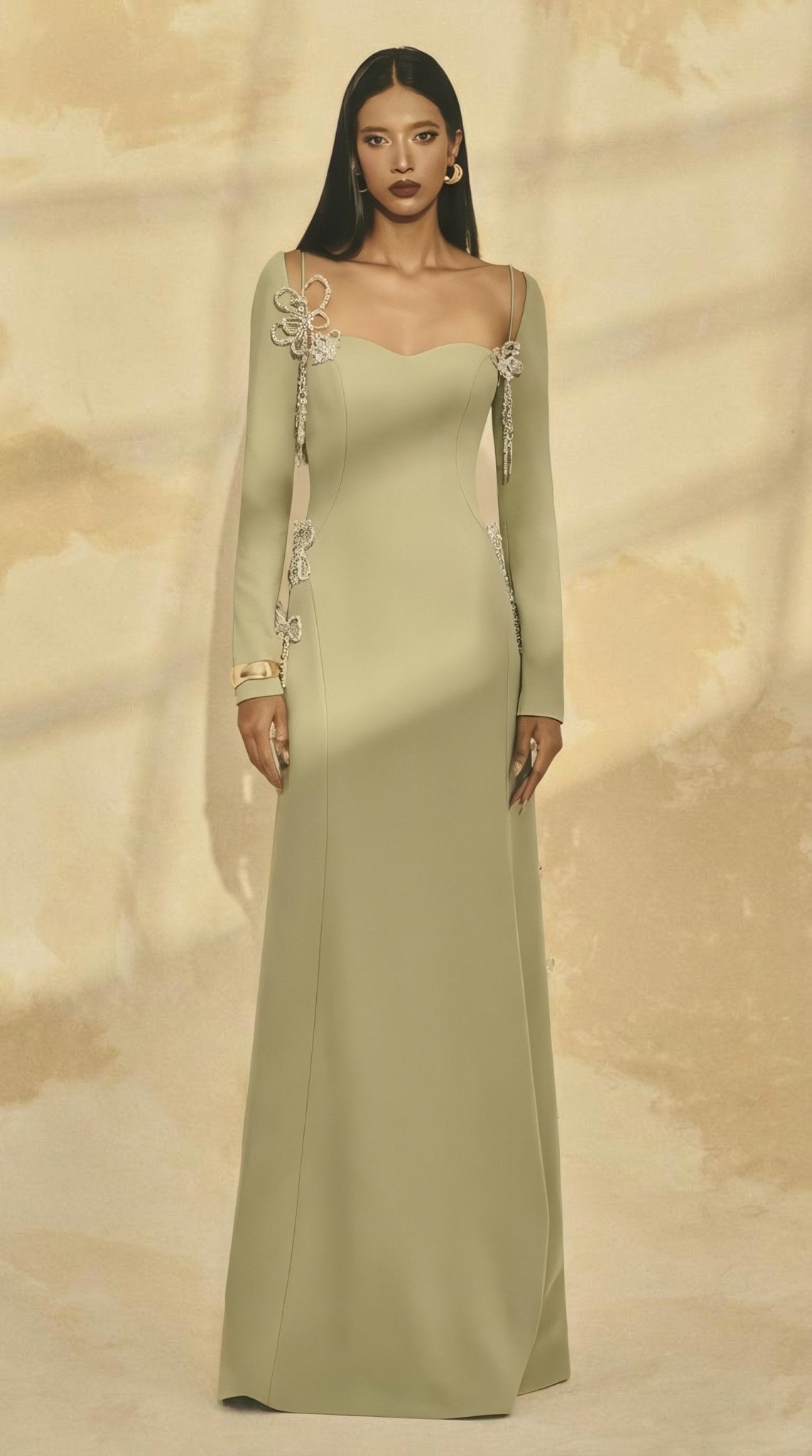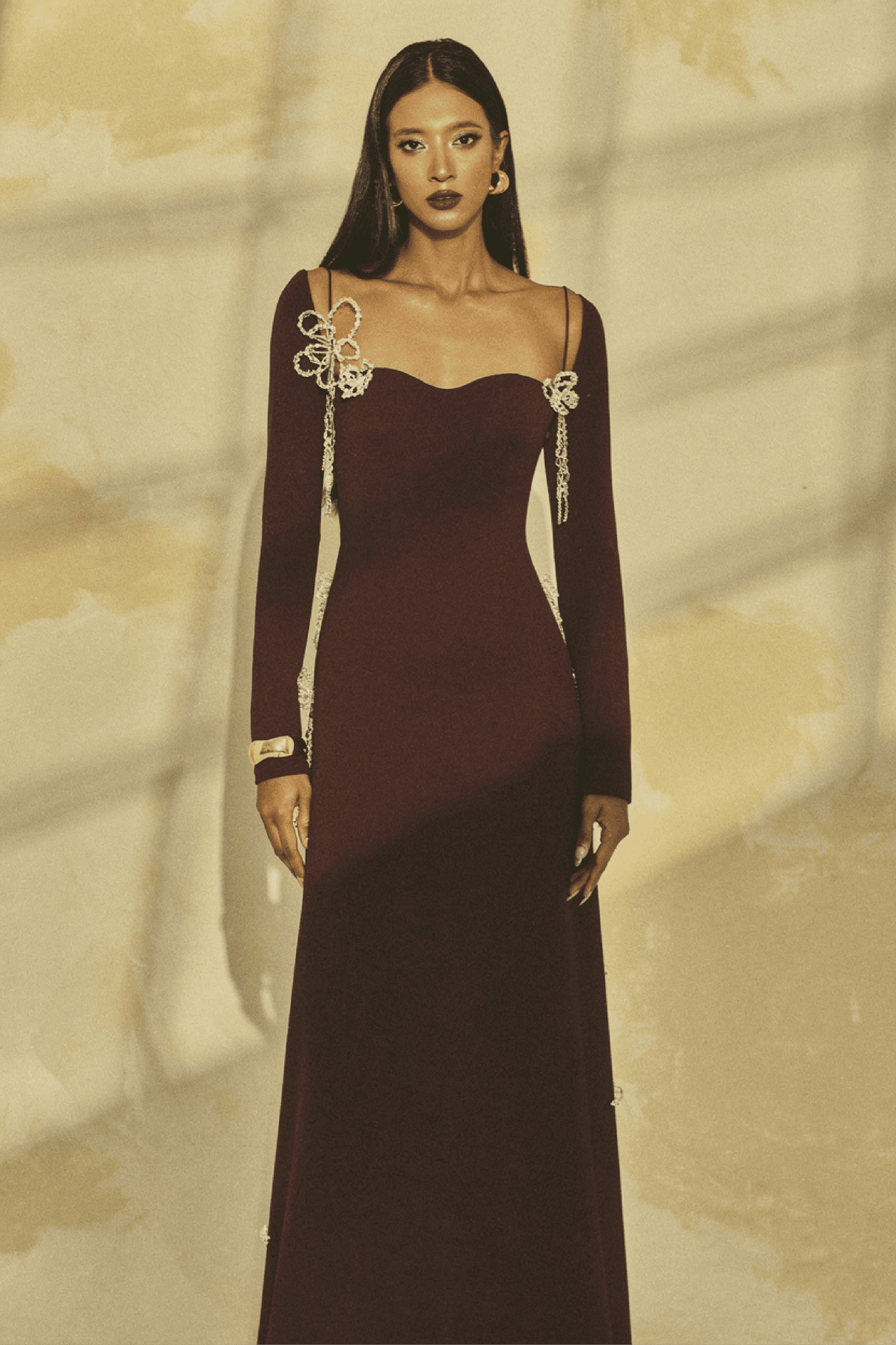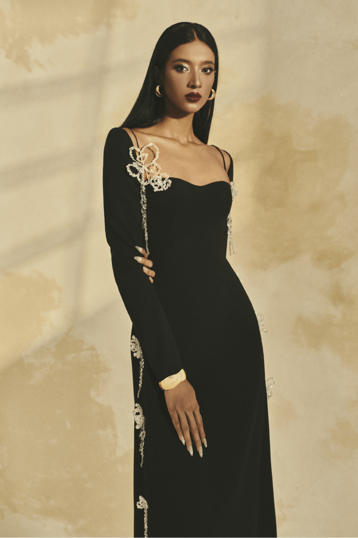 A sleek black column gown with long sleeves and delicate crystal embellishment at the neckline and shoulders. Defined by clean lines and a sculpted silhouette.