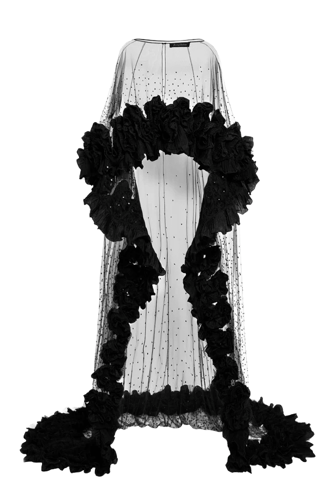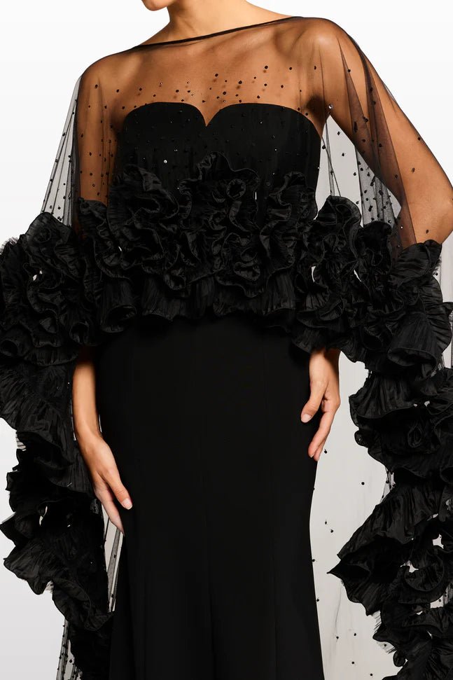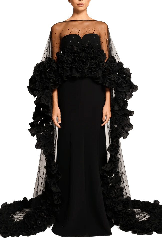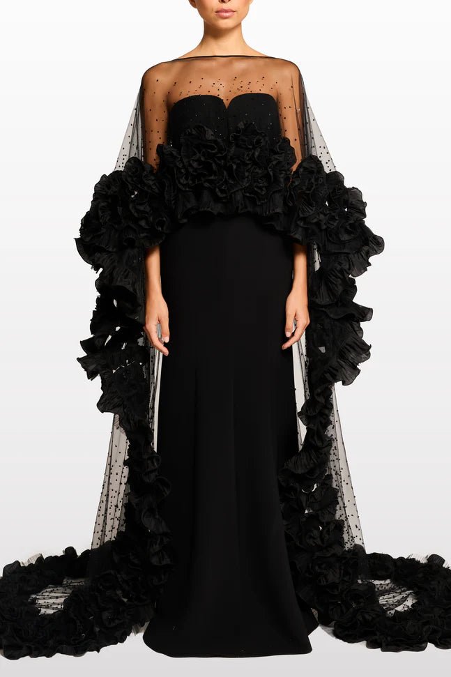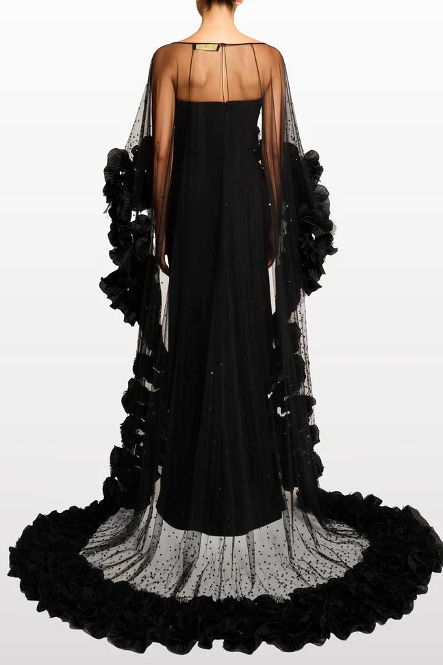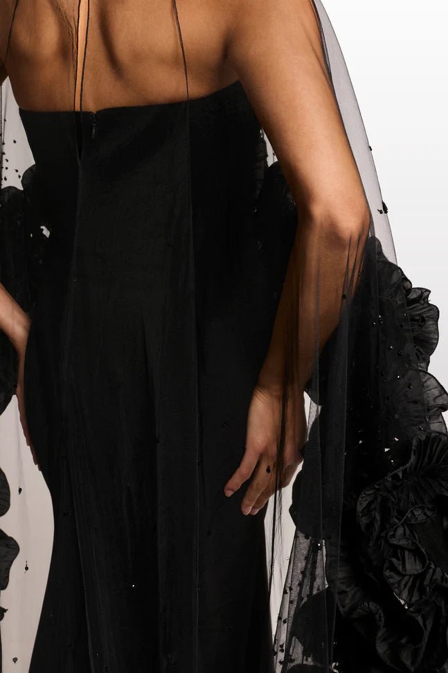 The sleek, strapless black gown forms a flawless foundation, sculpting the silhouette with a clean, floor-length column cut that feels timeless and sophisticated. Draped over it, the sheer tulle cape transforms the look into a statement piece—adorned with delicate micro embellishments at the neckline and finished with lavish, petal-like ruffled blooms that cascade along the arms and trail into a soft train.