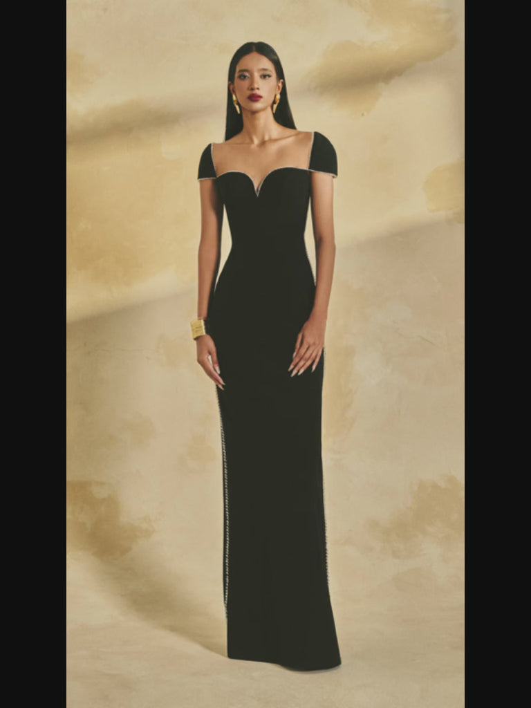 A refined black column gown with cap sleeves and a softly contoured neckline. Finished with subtle crystal detailing along the edges for a quiet, elevated finish.