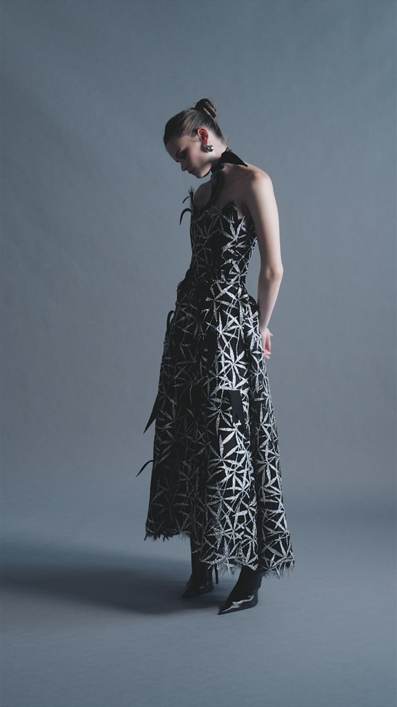 This breathtaking black tulle midi dress, adorned with shimmering silver leaf embroidery and delicate black ribbon accents, is the epitome of effortless elegance. This strapless dress features an A-line silhouette. Comprised of sheer, possibly tulle fabric with an abstract leaf-like geometric print in silver glitter. Black fabric appliqués are also layered onto this print, adding texture and depth.