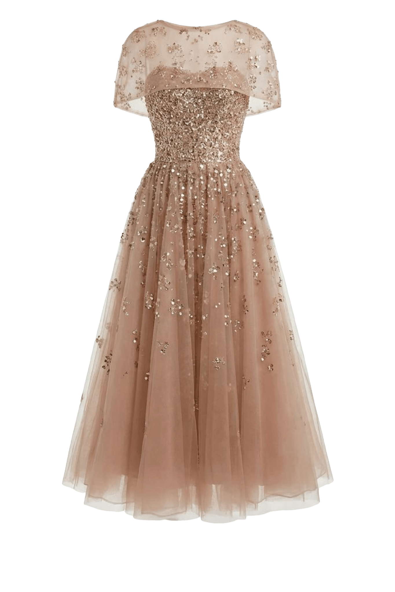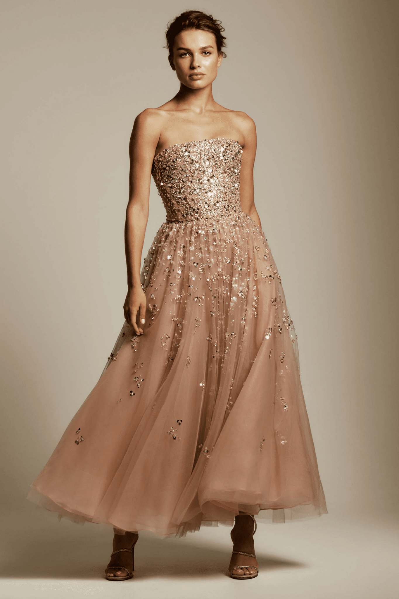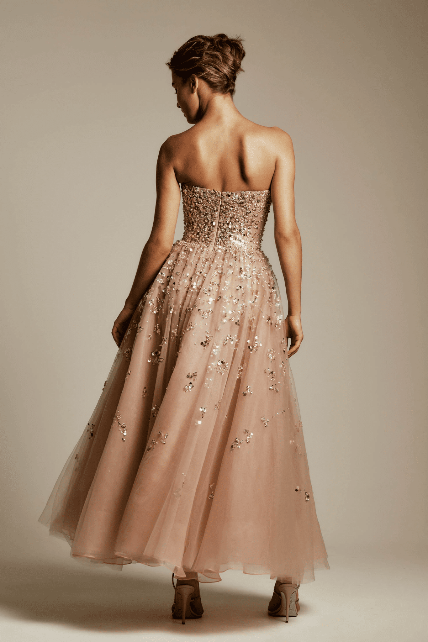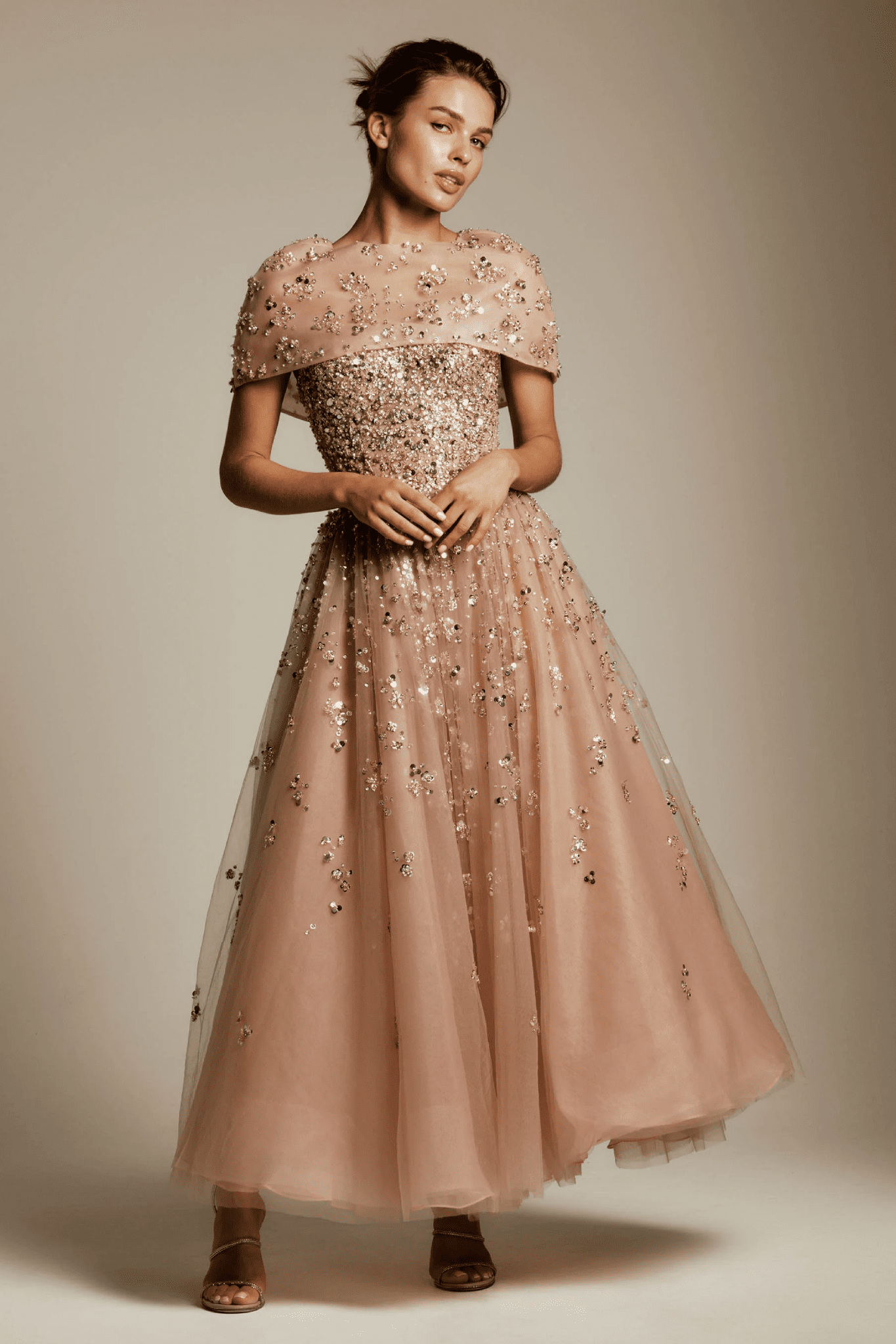 An elegant midi dress adorned with exquisite beadwork. The length makes it versatile for both cocktail hours and formal occasions. Paired with a cropped beaded jacket designed to layer effortlessly over gowns or separates for added sparkle.