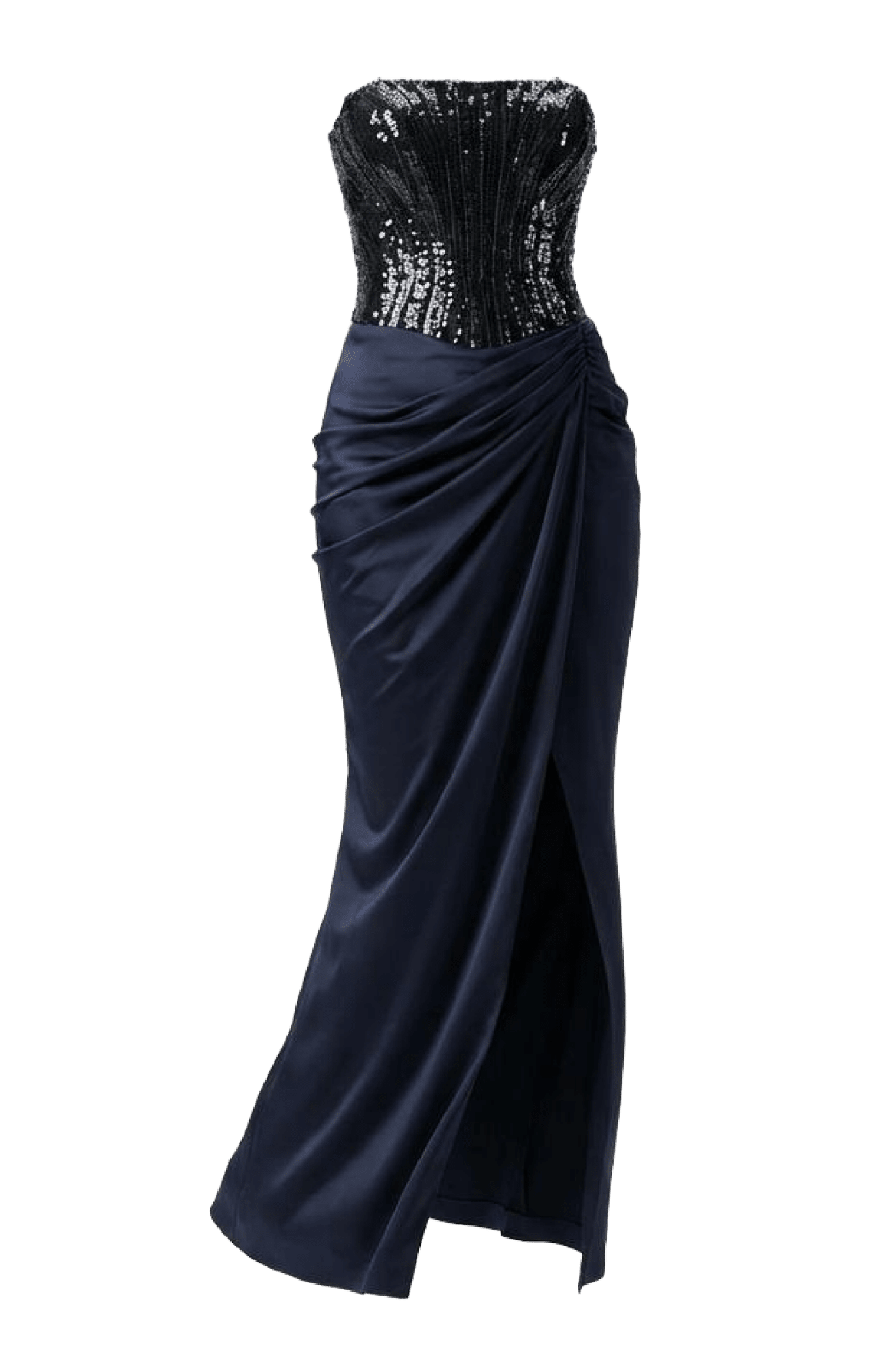 A strapless silhouette with a richly hand-beaded bodice and sleek skirt. The contrast of texture and simplicity creates a modern yet timeless evening look.