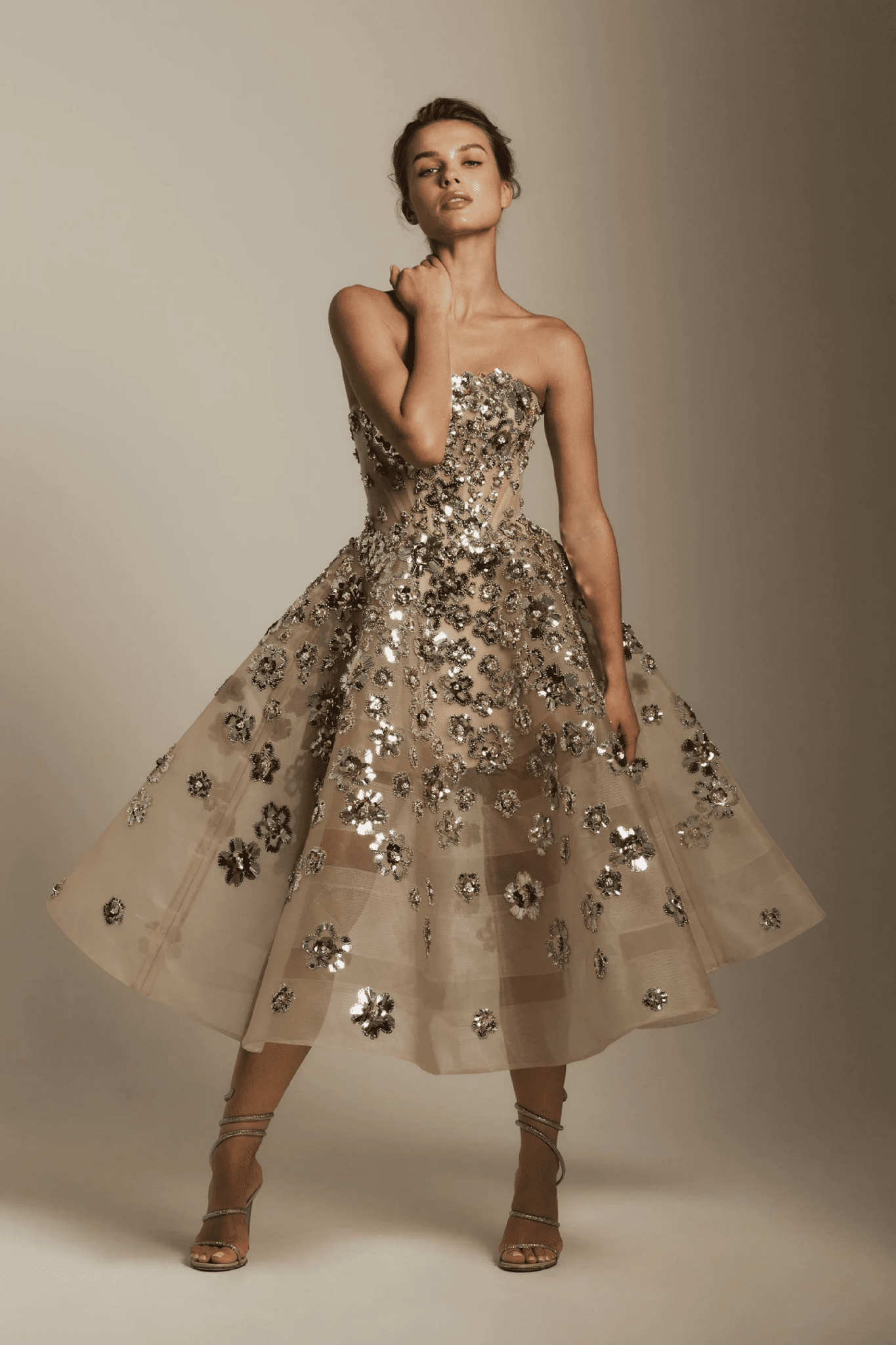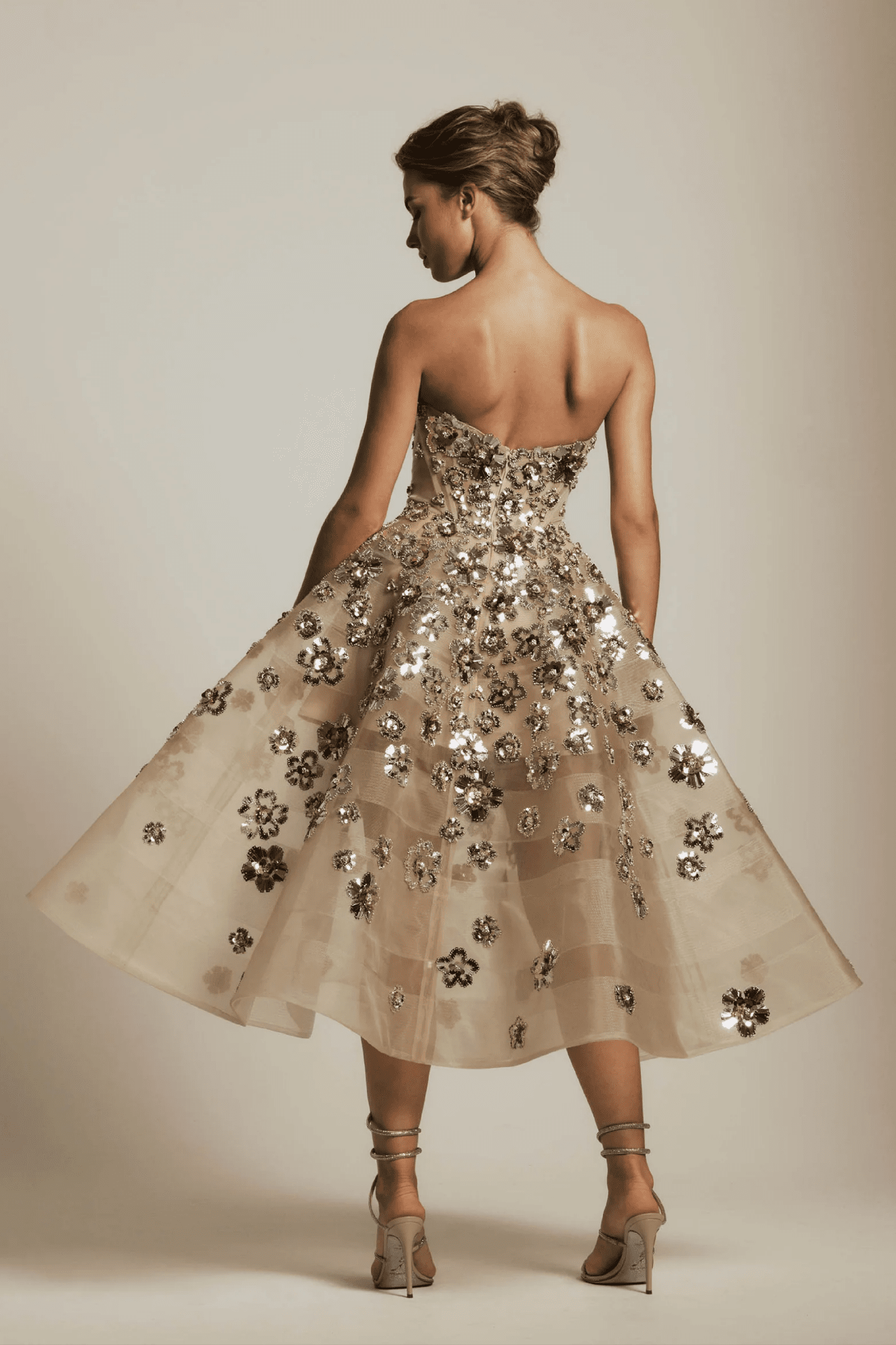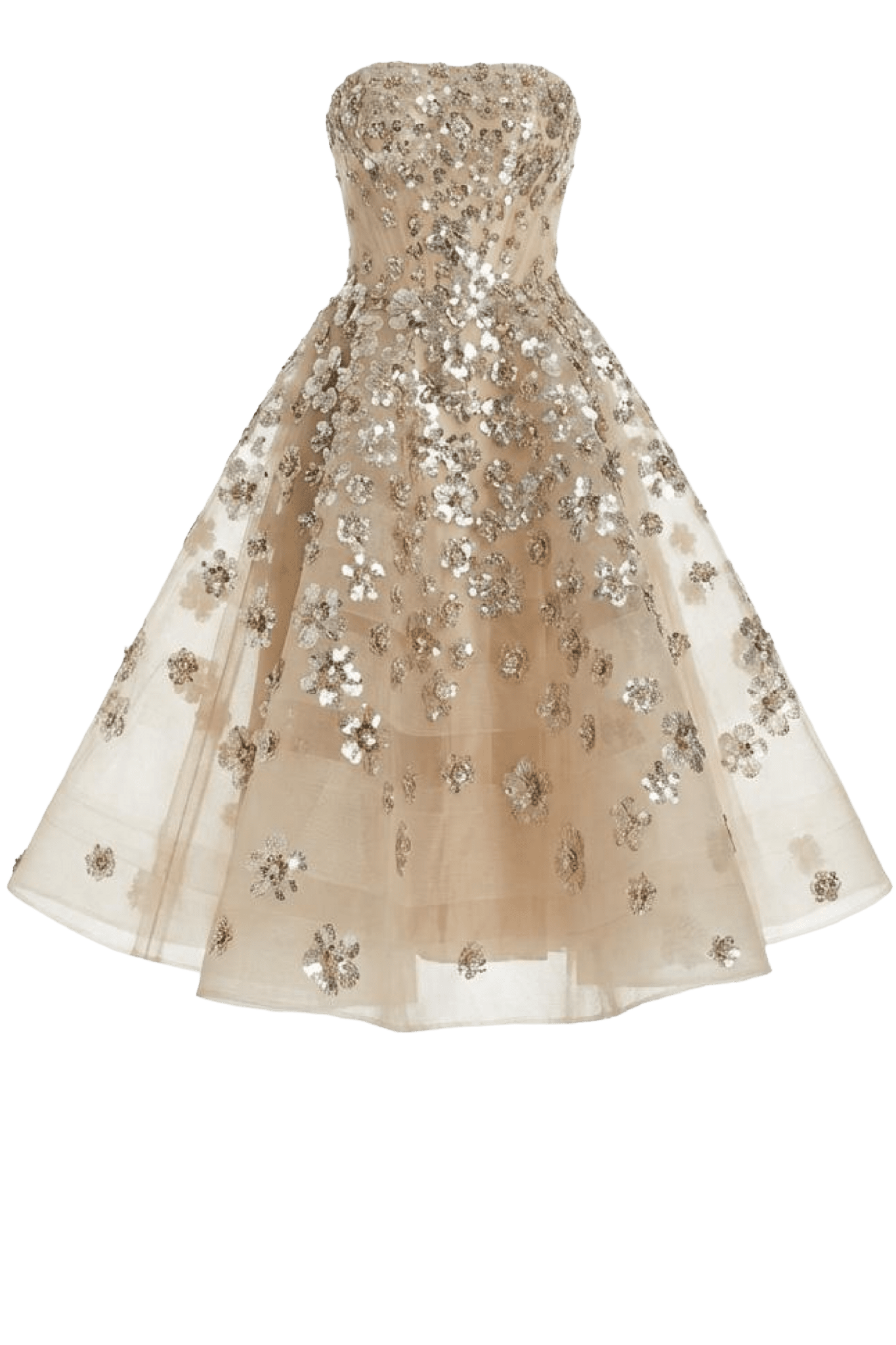 Shimmering metallic florals dance across this strapless midi dress. It is adorned with metallic flowers — a custom design exclusive to the collection.