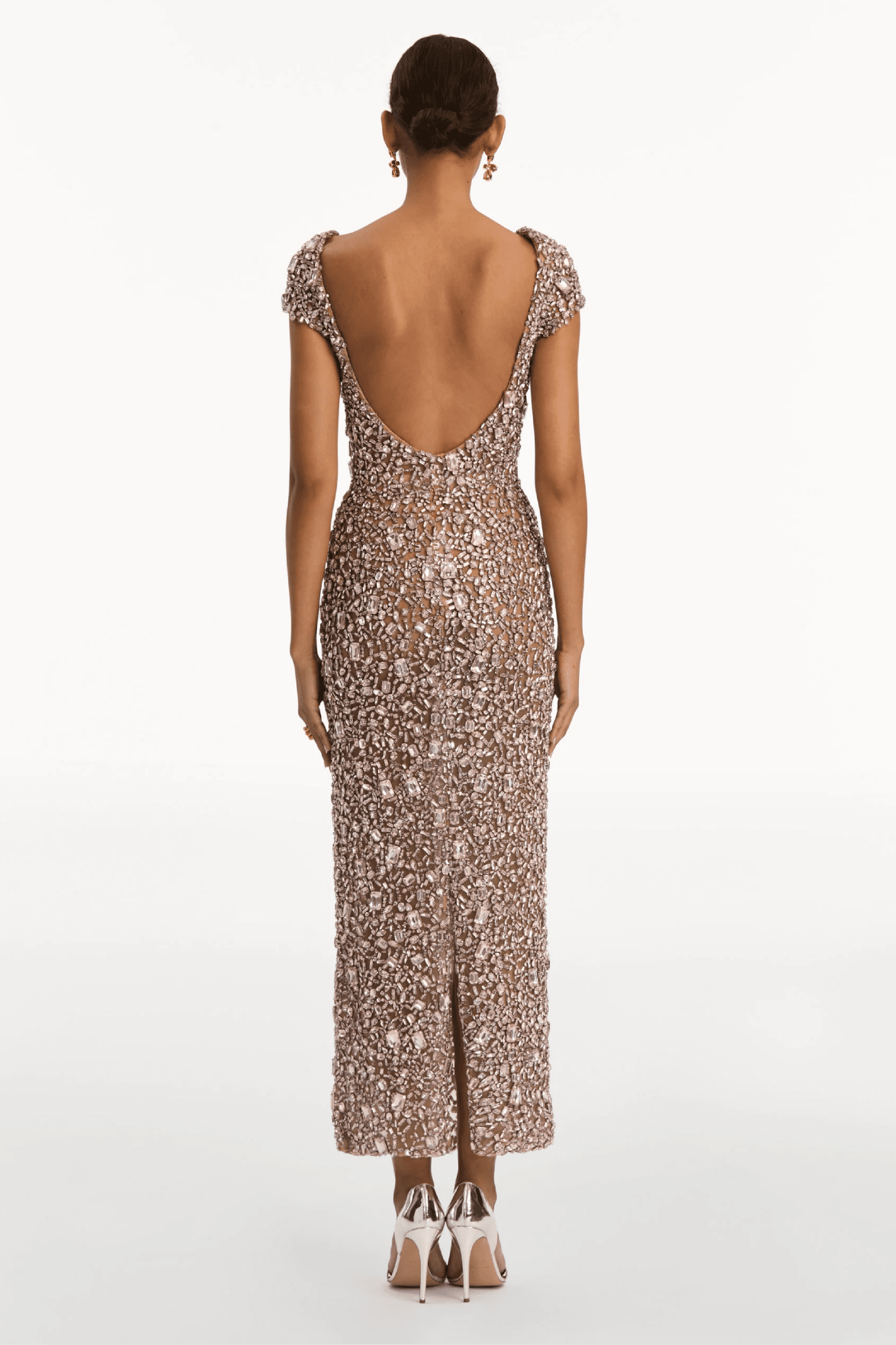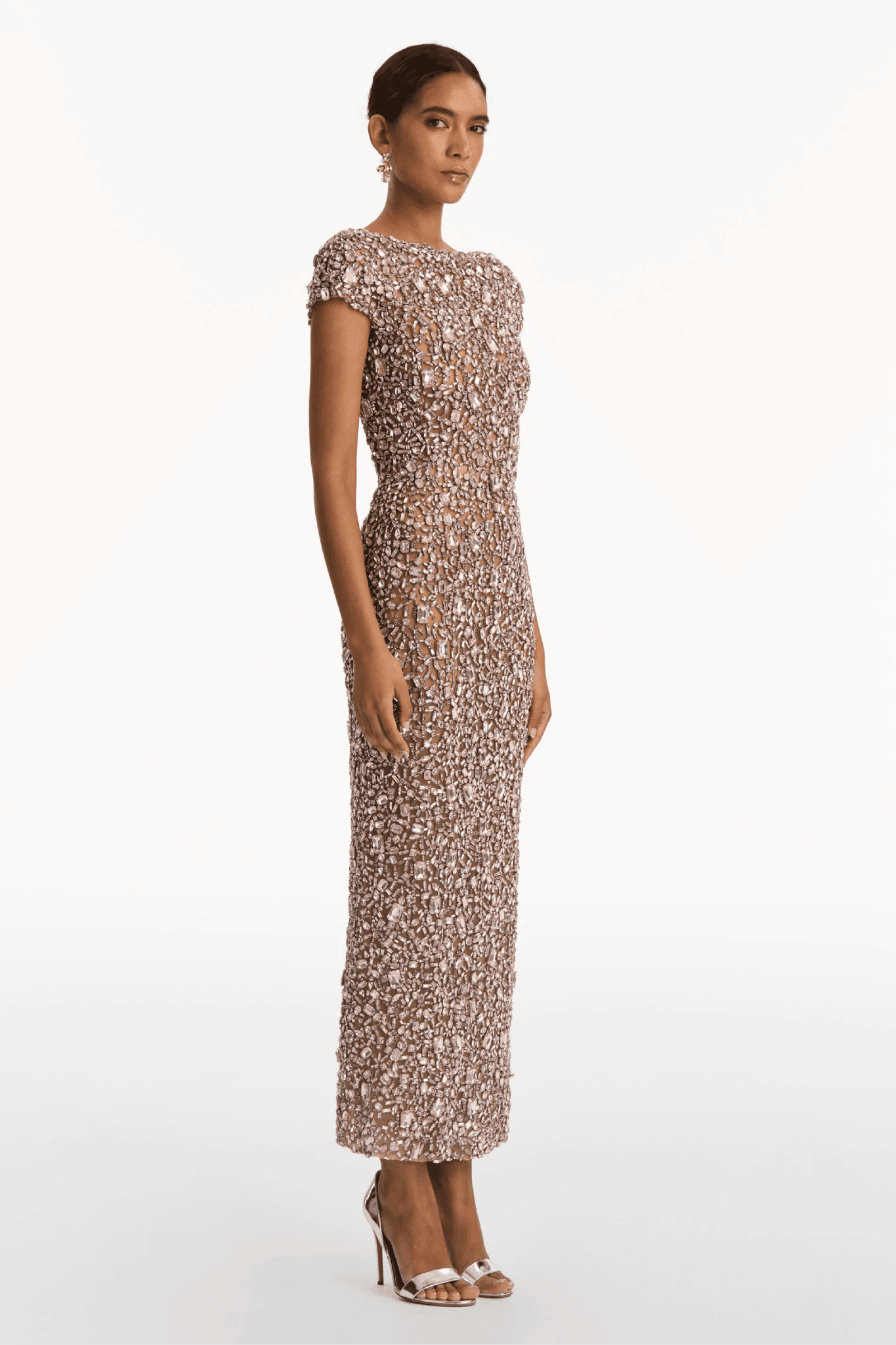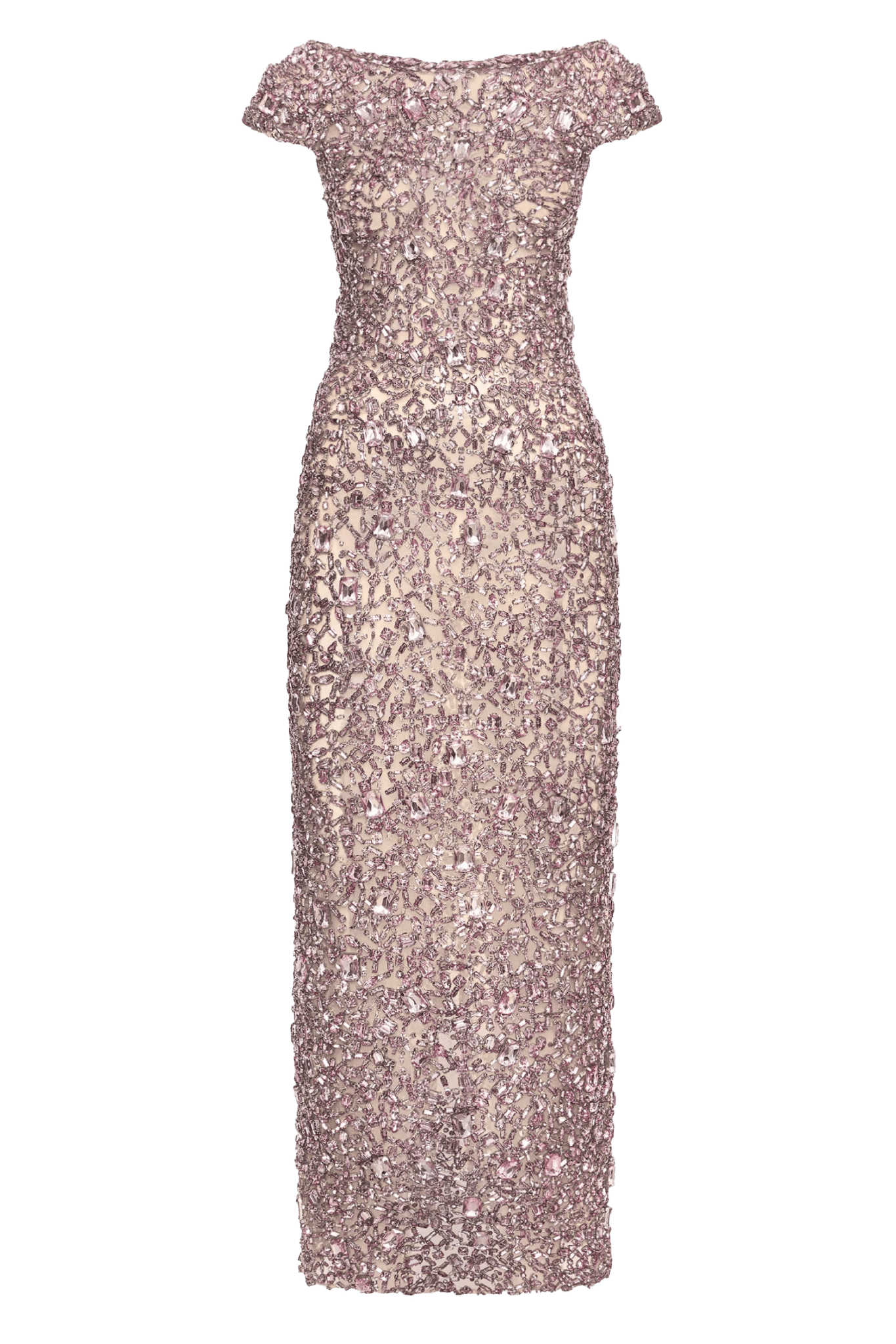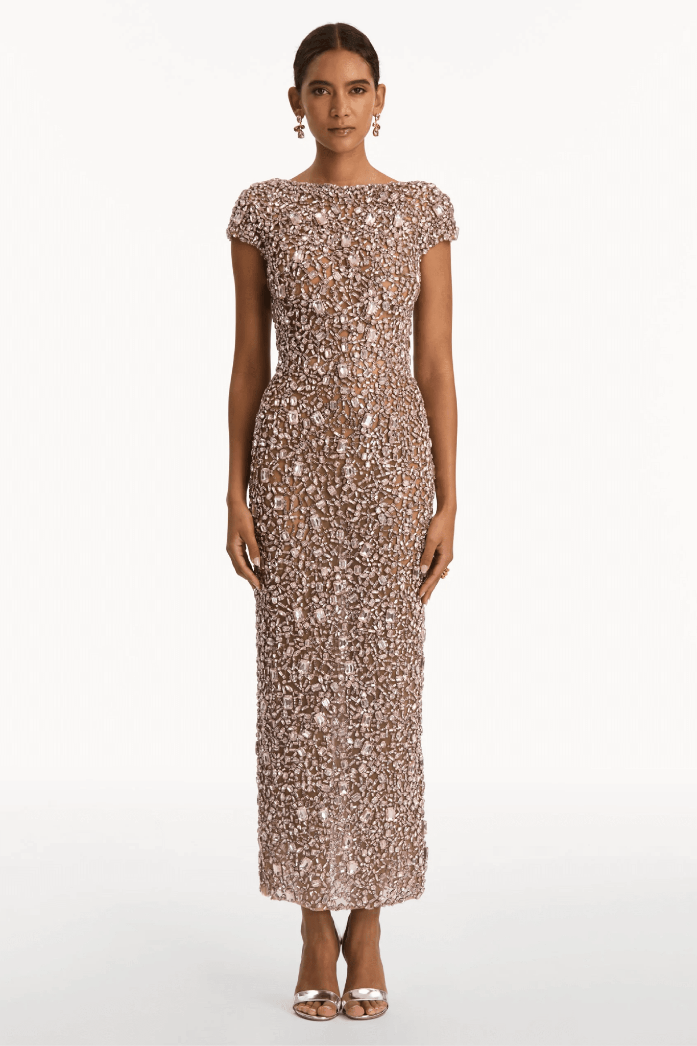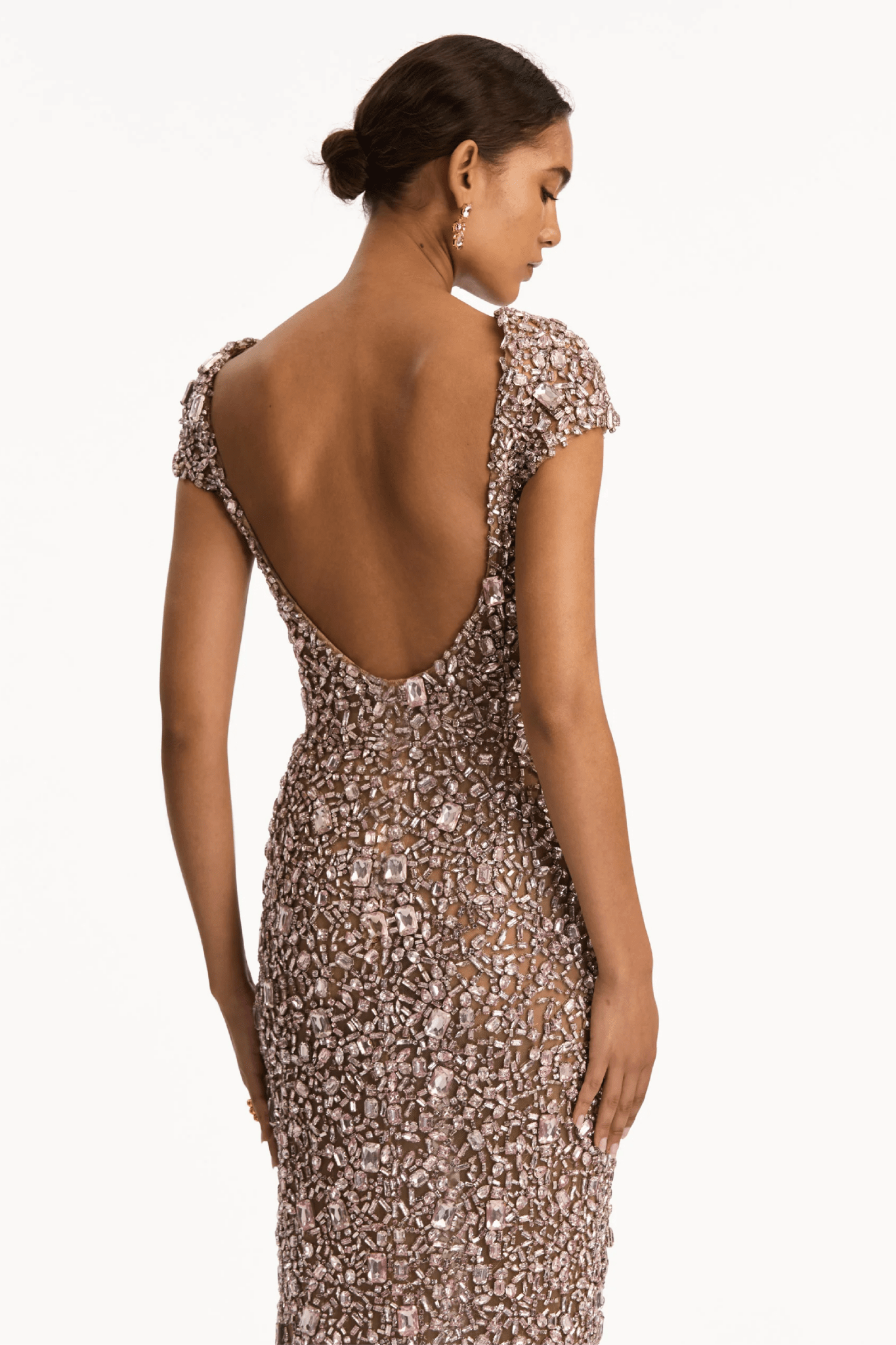 This gown is richly adorned in an allover embroidery of mixed crystals, each stone meticulously placed to form a luminous mosaic. The cap sleeves and column silhouette serve as a refined backdrop, allowing the jeweled surface to command attention in a radiant study of light and texture.