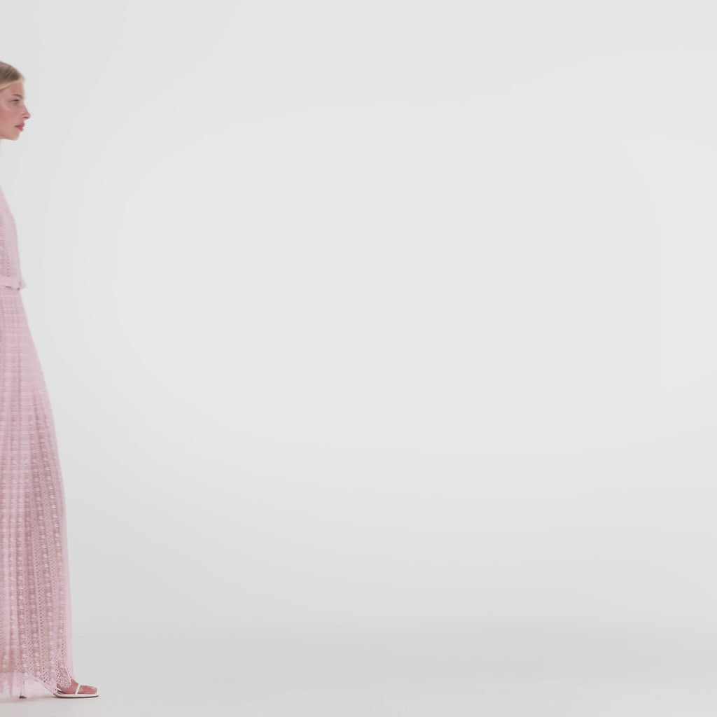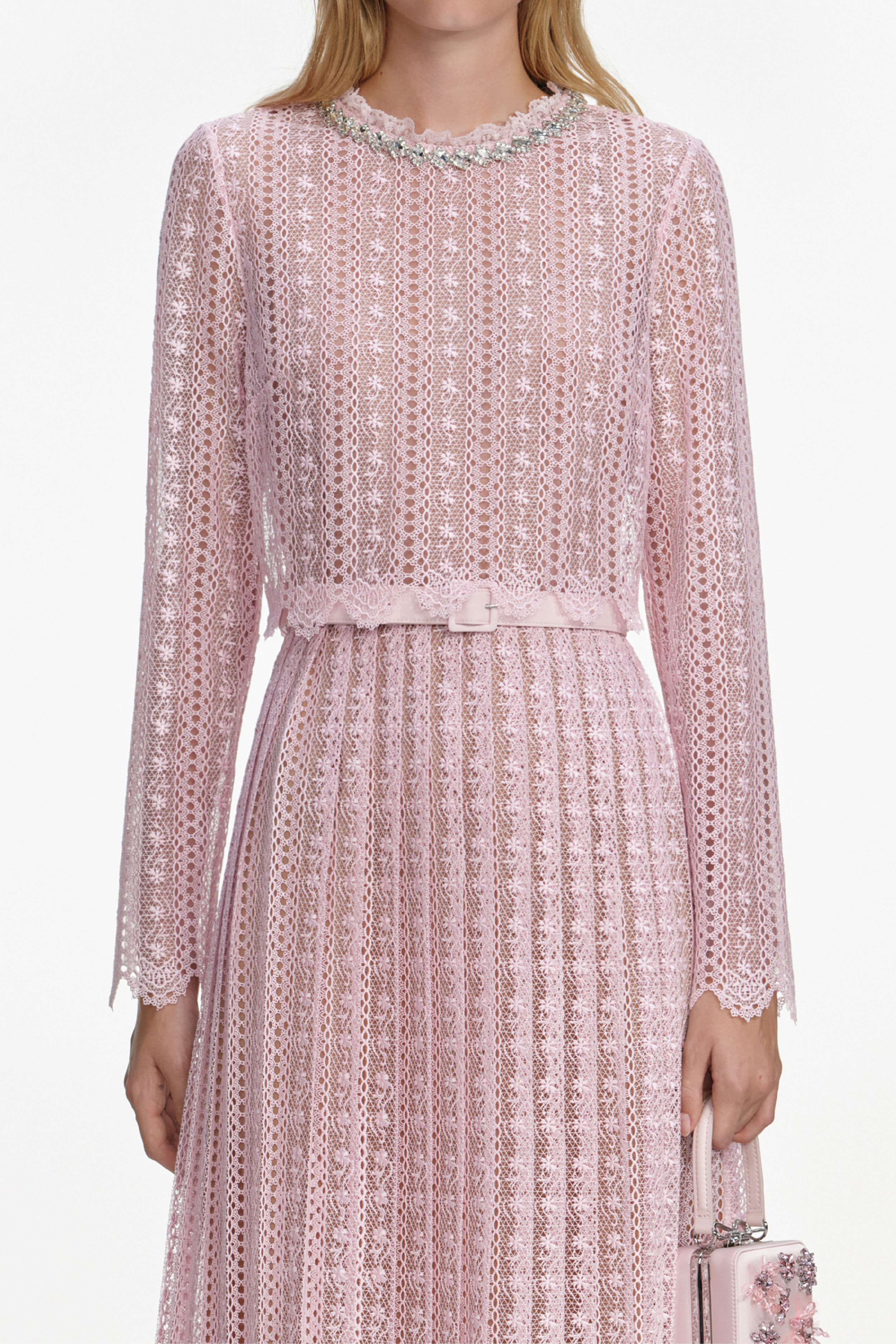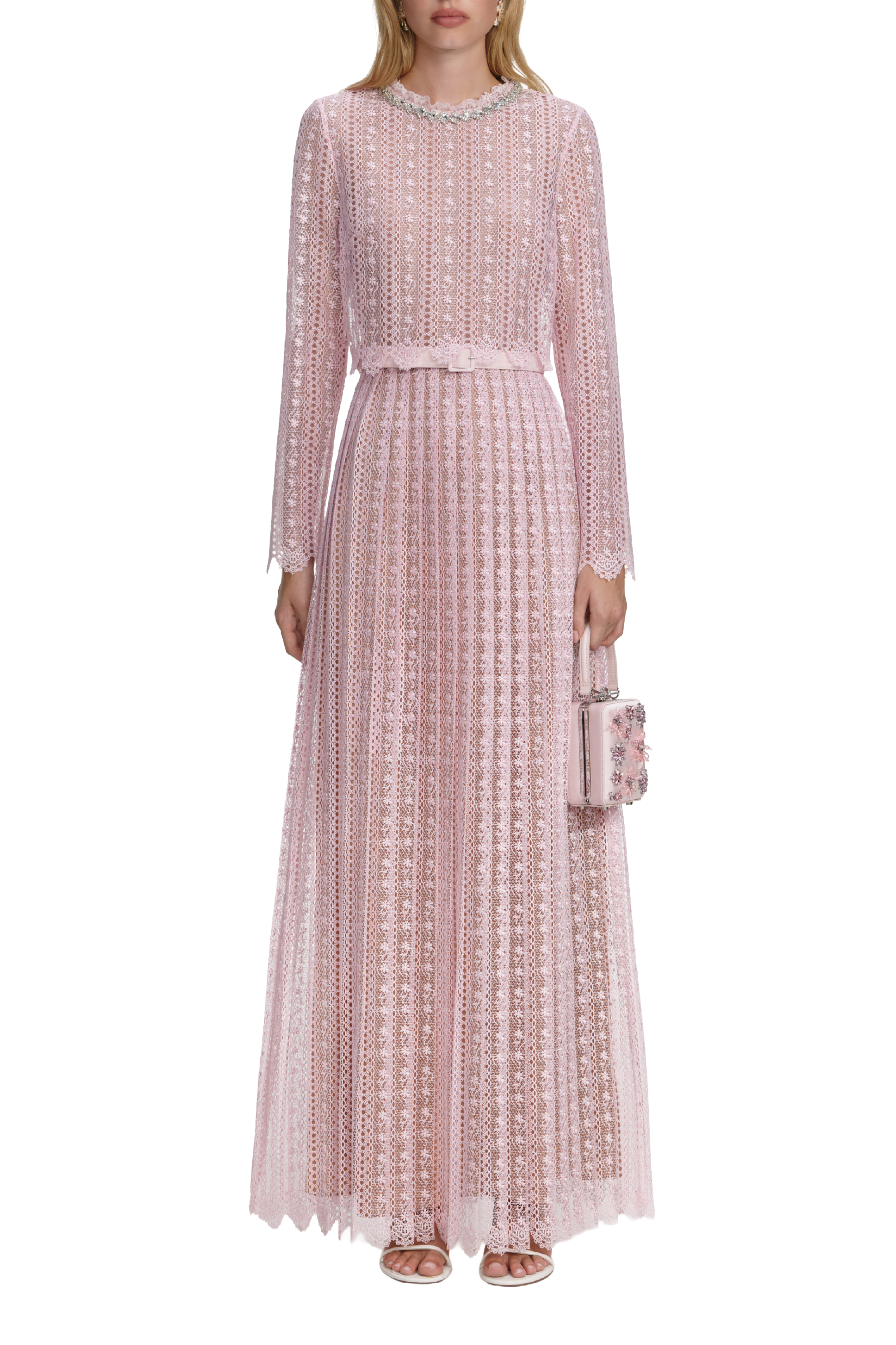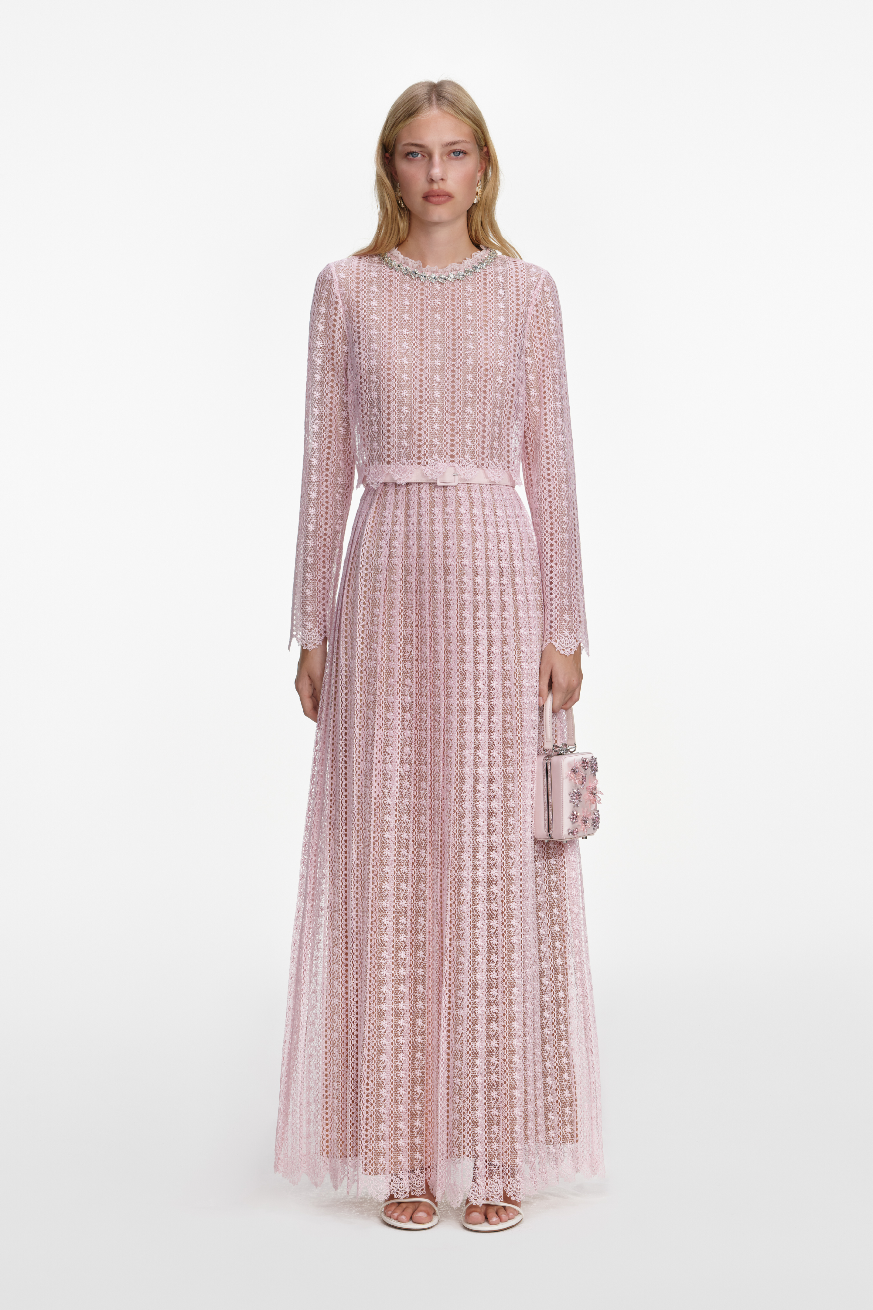 Delicate striped floral lace gives this pink maxi dress its ethereal appeal. Accessories come included with a tonal belt that cinches in the waist and diamanté trims that encircle the neckline.