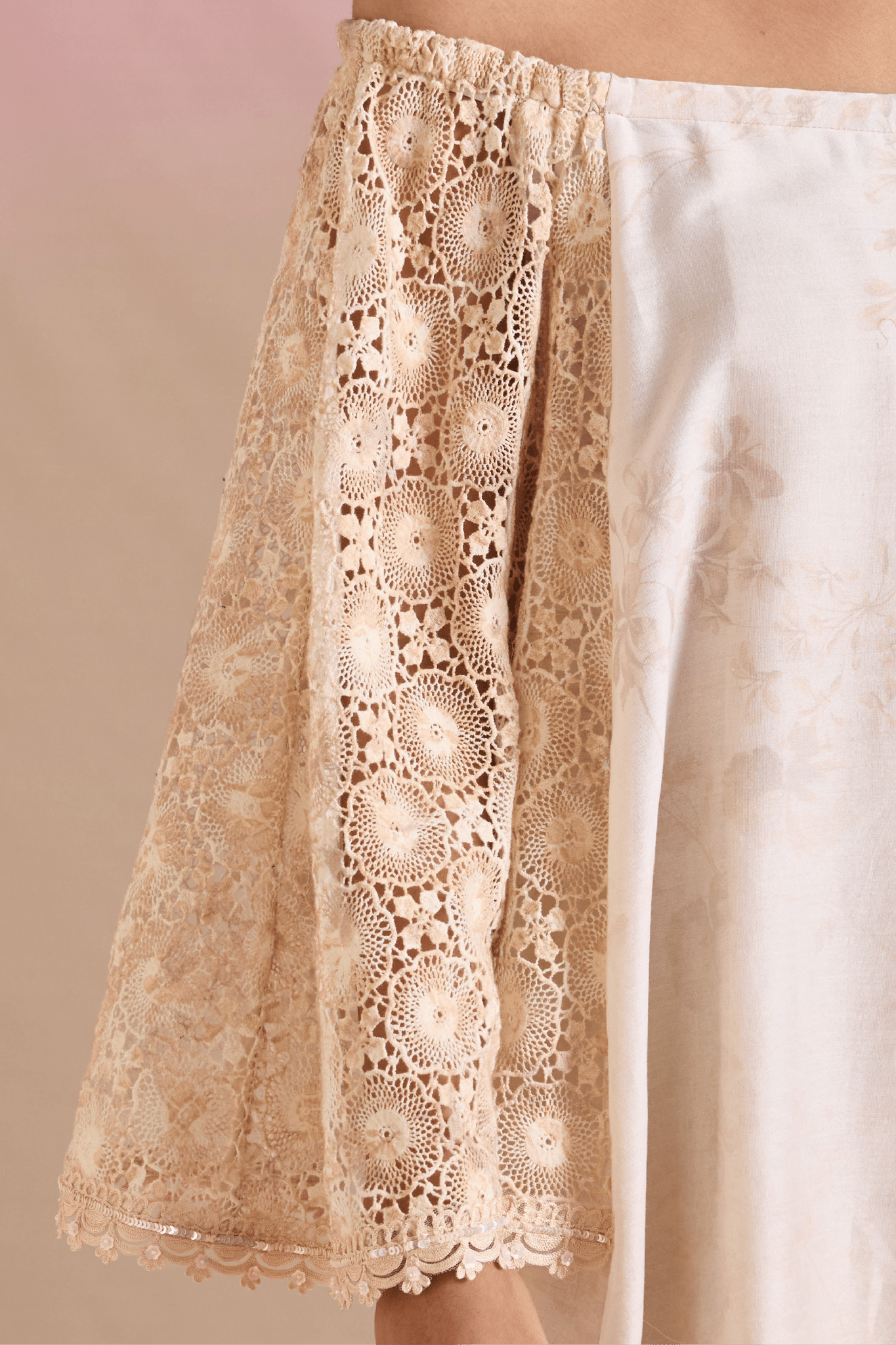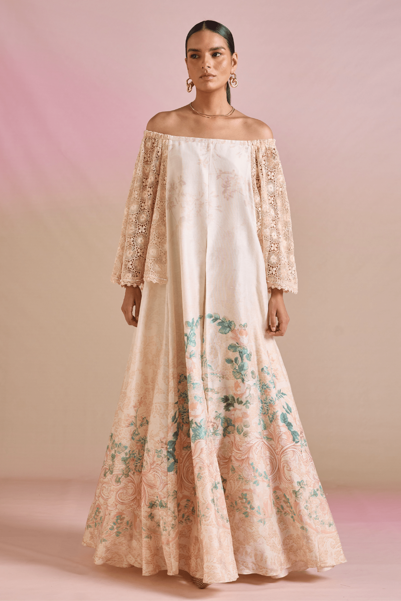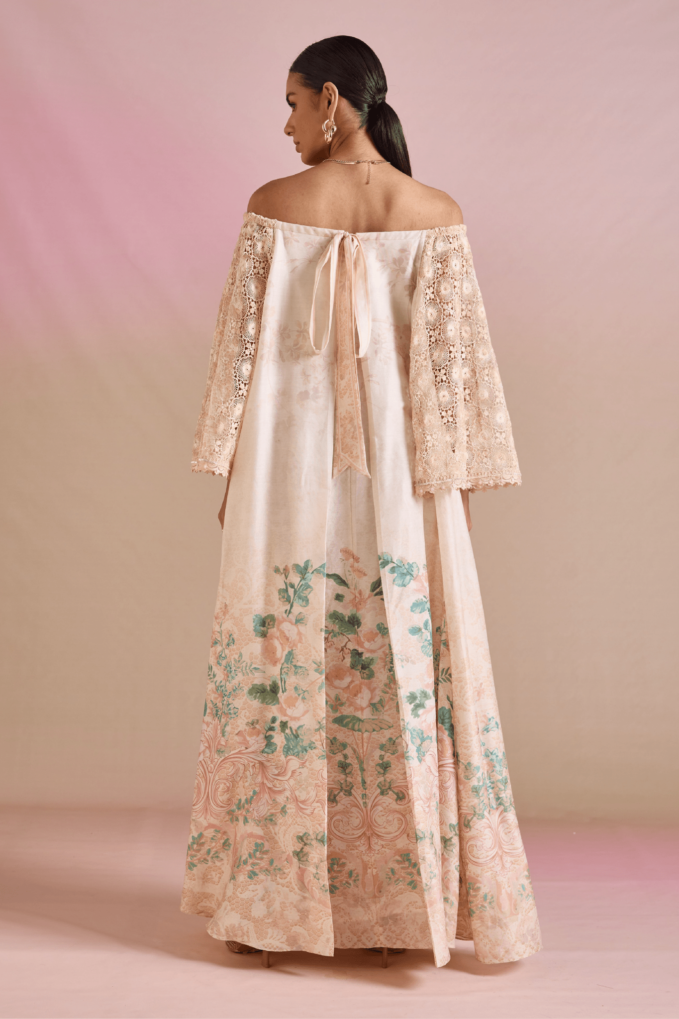 Designed with a relaxed, flowing silhouette, the dress features an elegant off-the-shoulder neckline framed by intricate lace sleeves that add texture and lightness. The softly structured bodice falls into a sweeping A-line skirt, finished with an ornate floral and scroll motif along the hem in blush, sage, and ivory hues.