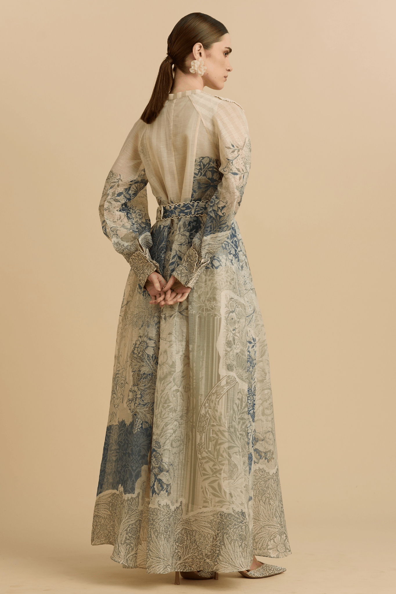 The long sleeves add balance to the fluid skirt, while the painterly botanical motifs evoke heritage textiles with a modern sensibility. Lightweight yet refined, it is a statement piece designed for elevated daytime occasions, intimate gatherings, or refined resort dressing.