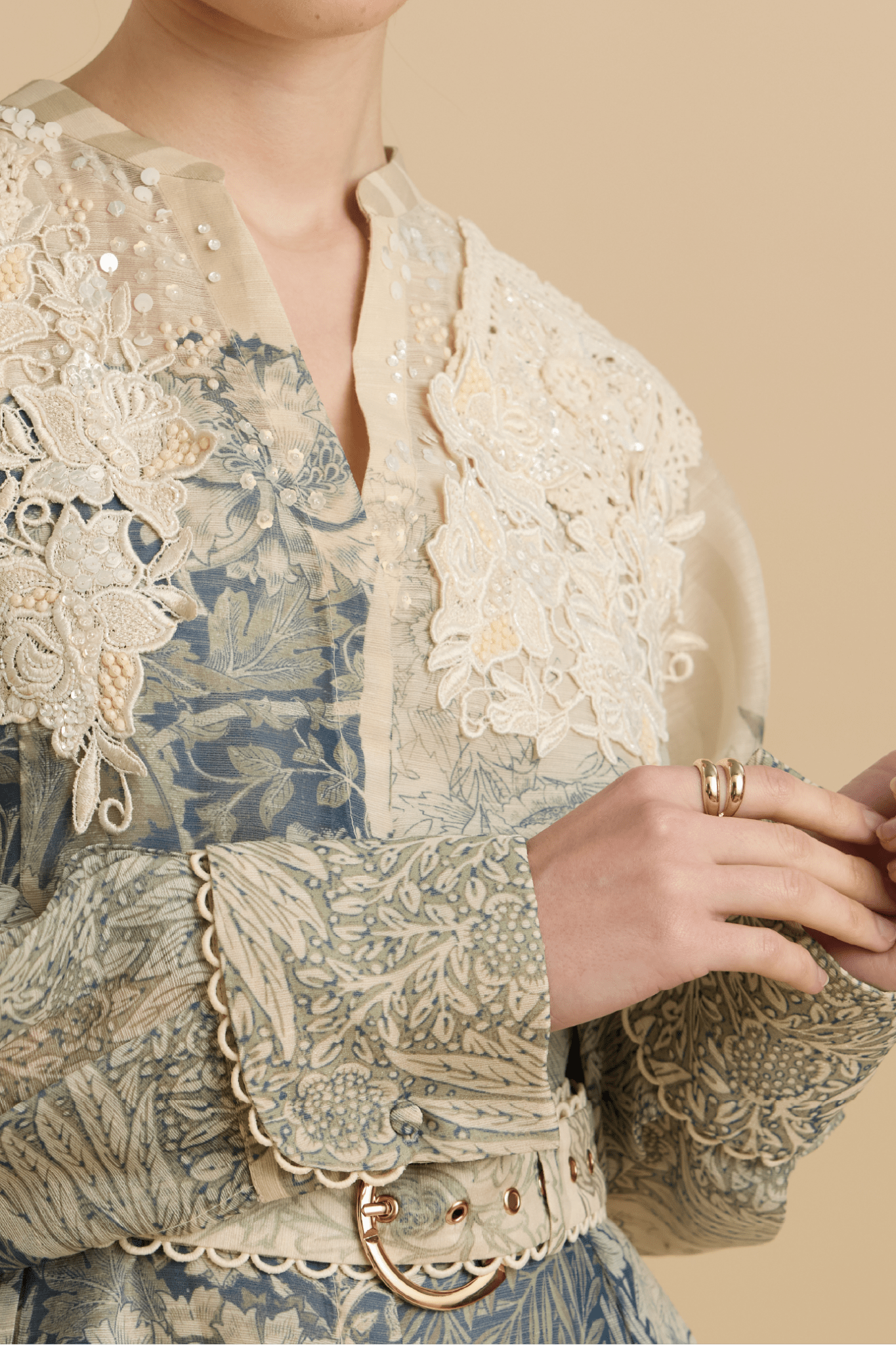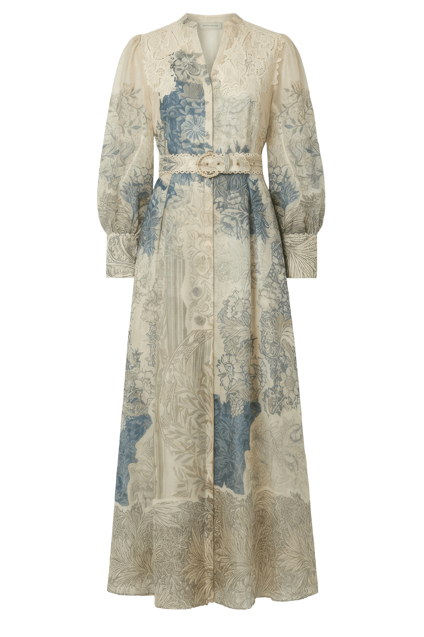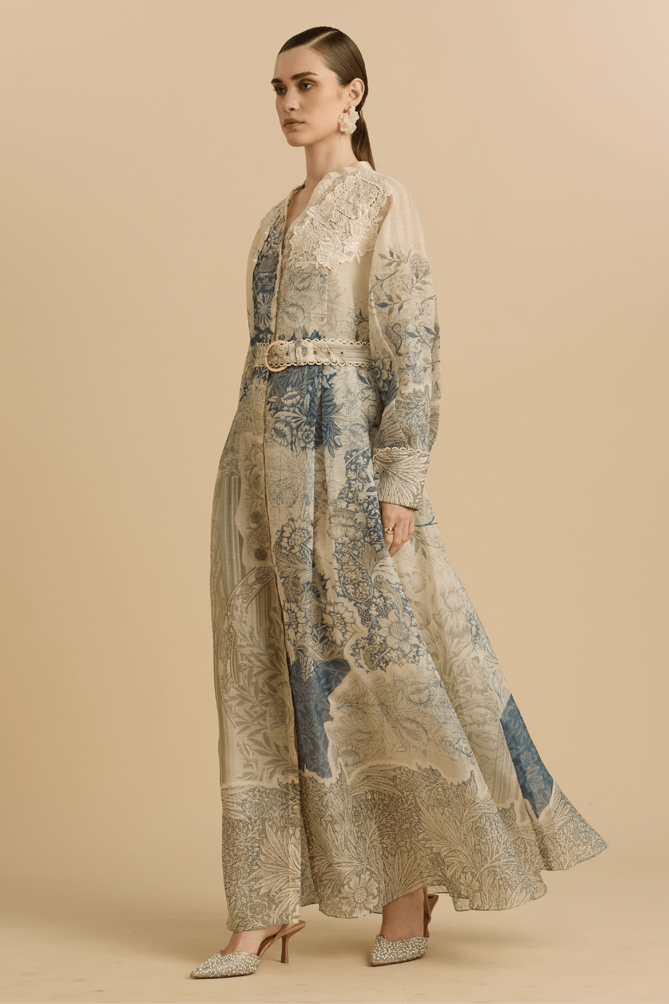 An ode to romantic craftsmanship, this flowing maxi dress is rendered in a tapestry-inspired print that blends soft sage, muted blue and antique ivory tones. Intricately detailed with lace appliqué at the shoulders and finished with a coordinating belt to define the waist, the silhouette moves with quiet elegance while maintaining structure and poise.