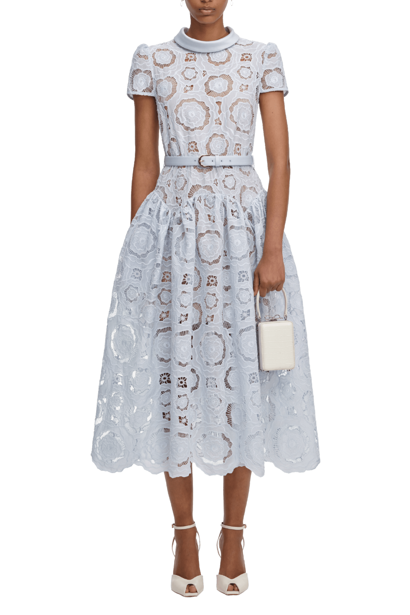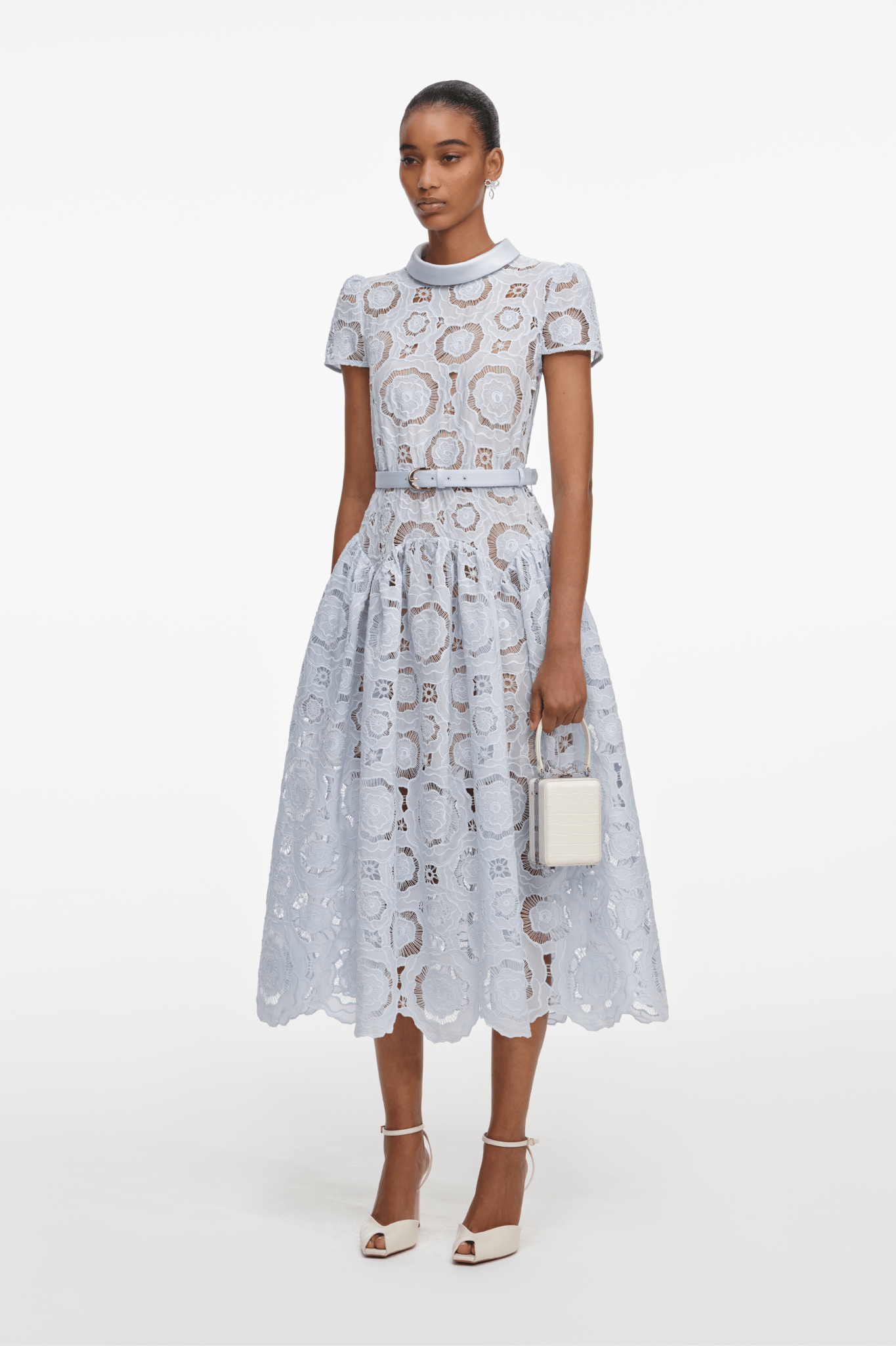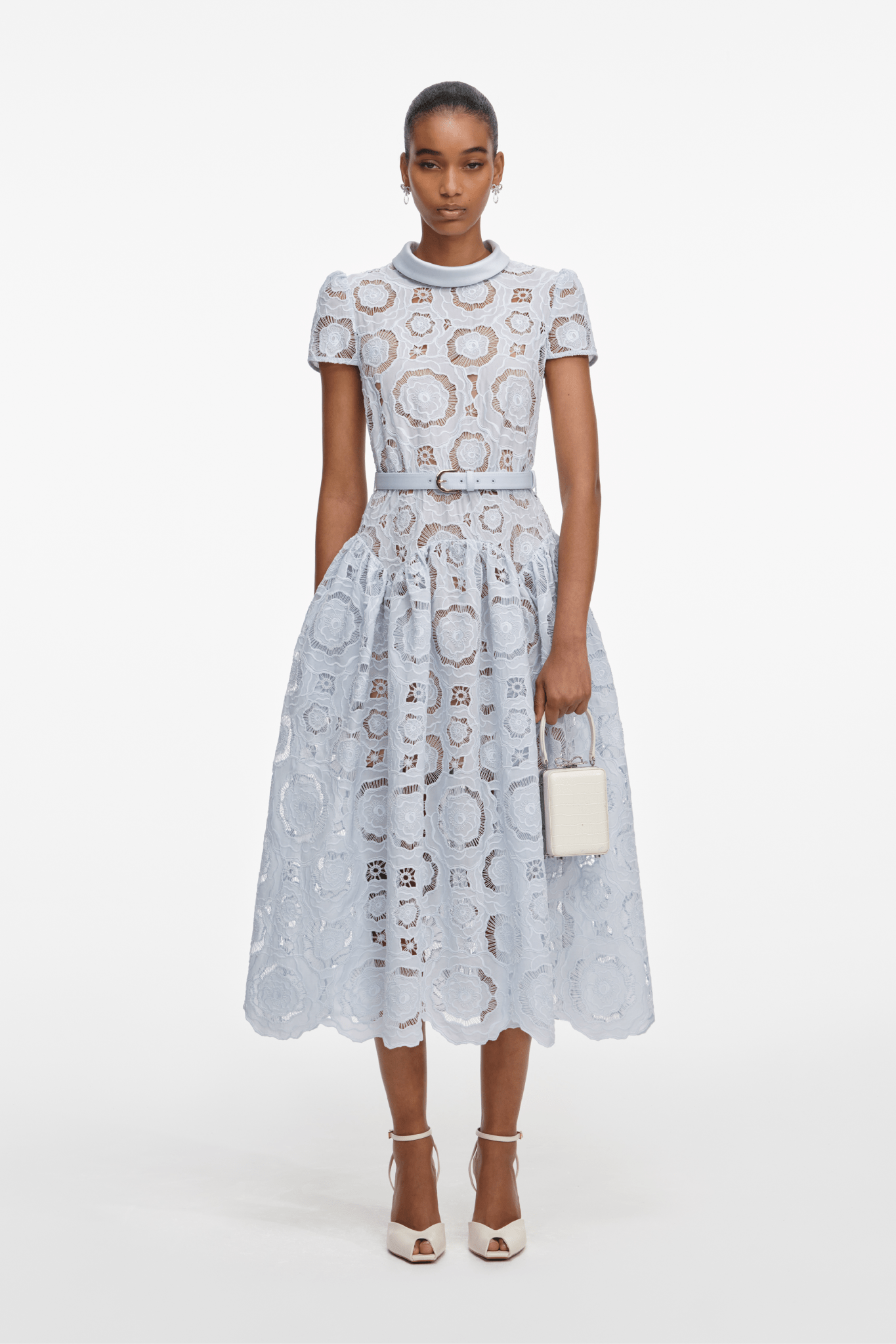 Elegance doesn't get any more ethereal than this blue floral lace dress, with its elegant high neckline, tonal belt and full midi skirt with scalloped hem. Add heels for the next invite-only event.