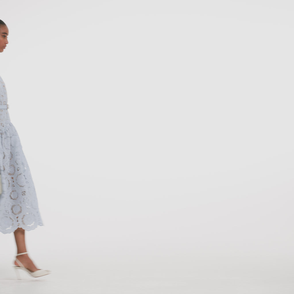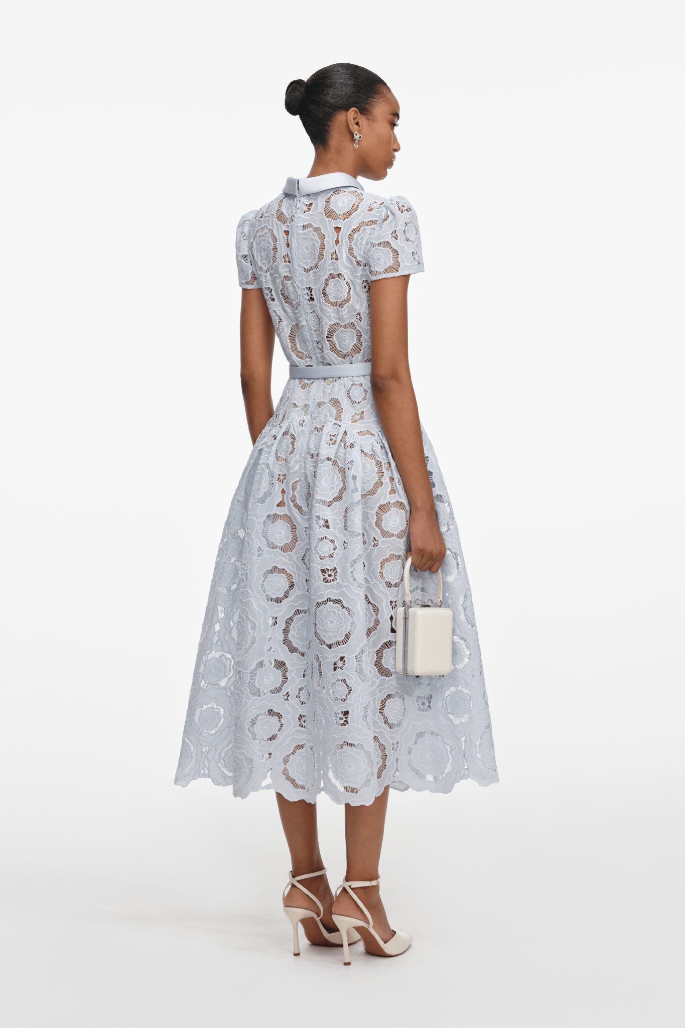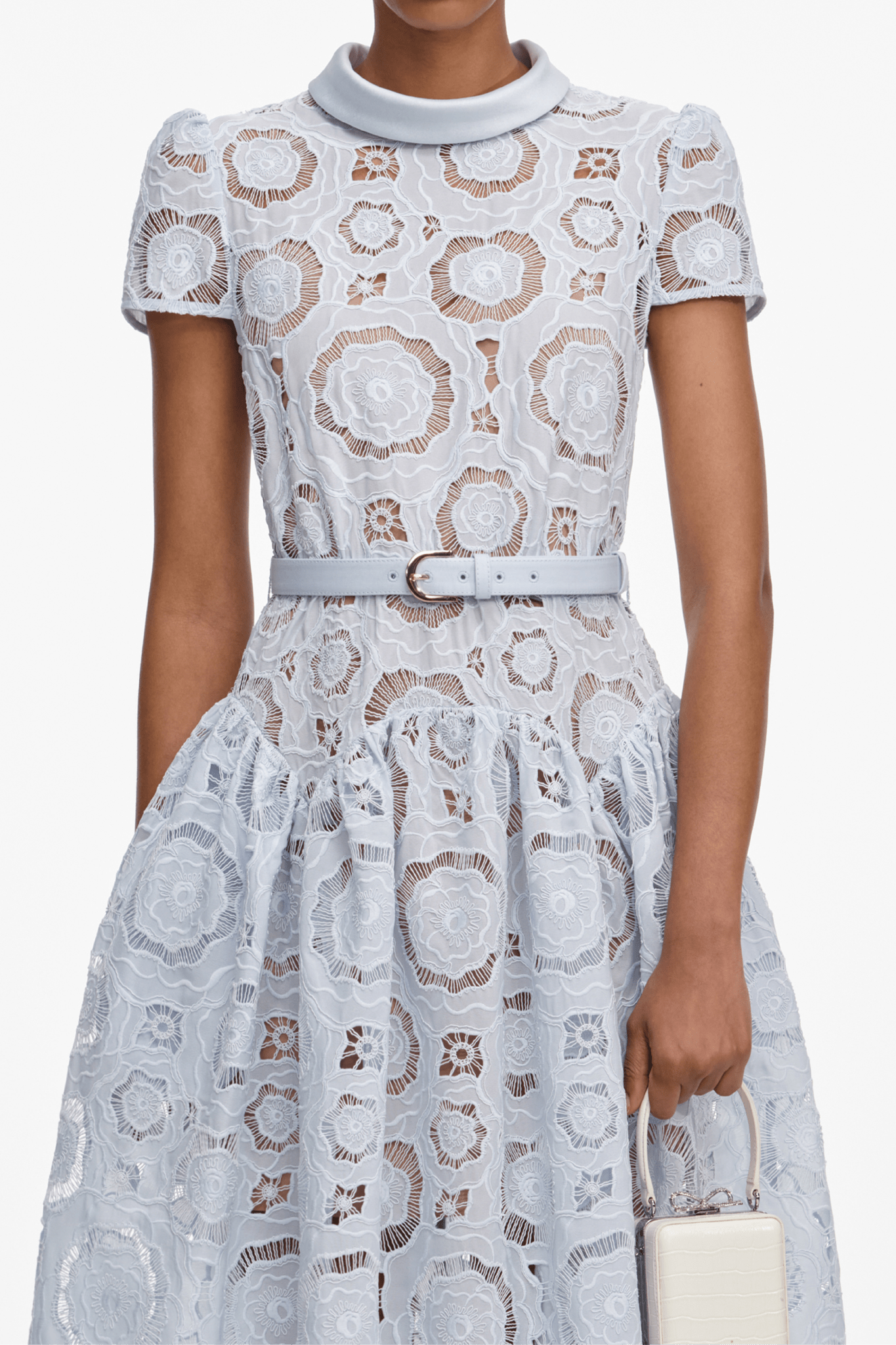 Elegance doesn't get any more ethereal than this blue floral lace dress, with its elegant high neckline, tonal belt and full midi skirt with scalloped hem. Add heels for the next invite-only event.