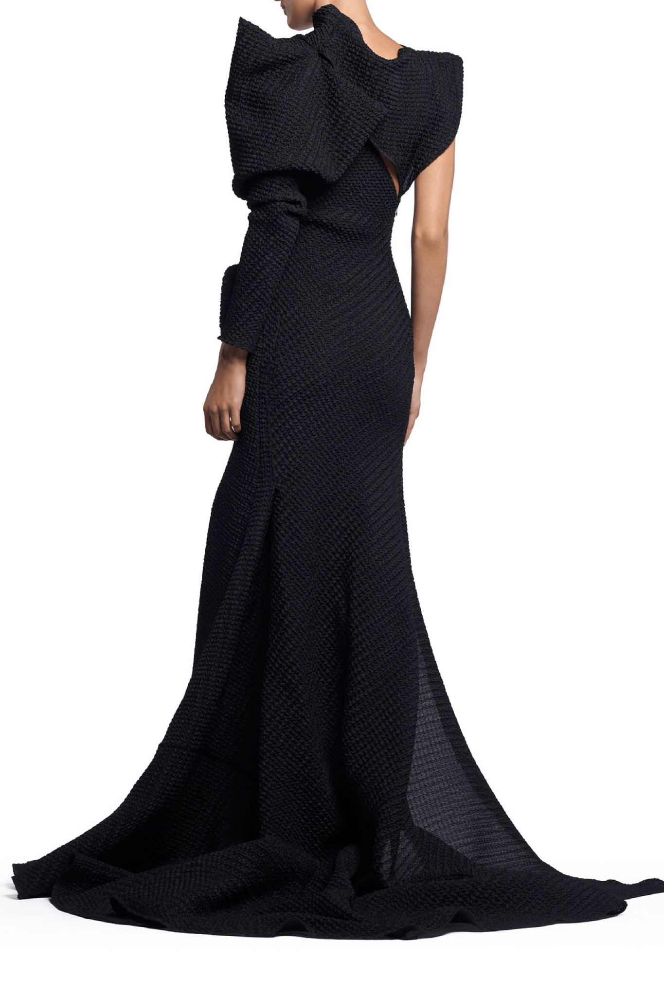 Sculpted to perfection. This gown is cut from a waffle-like fabric, featuring a dramatic one-shoulder design, and a figure-flattering silhouette that flows gracefully to the floor. The high neck and architectural details add an air of sophisticated modernism.