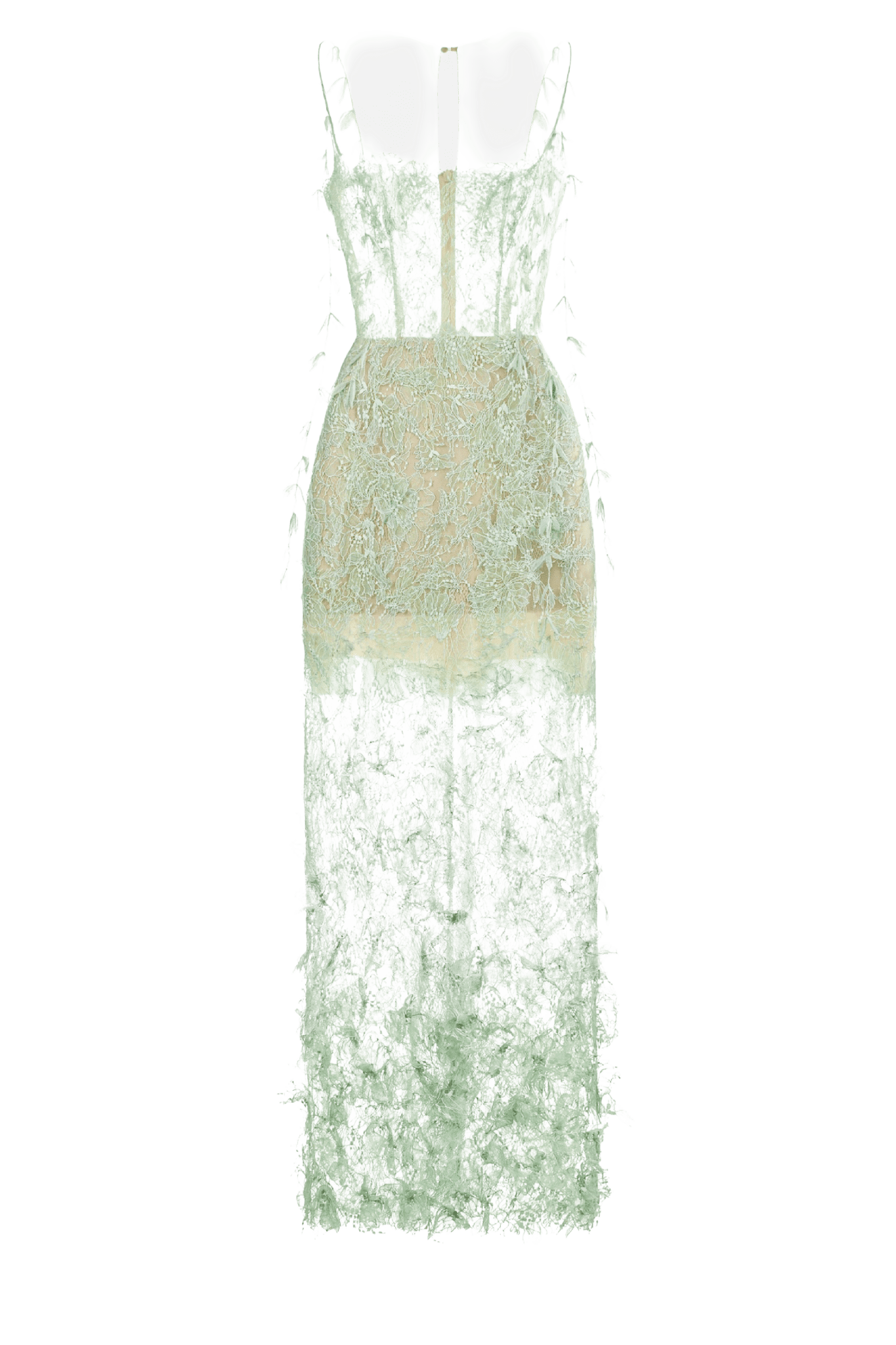 Delicate, refined, and exquisitely crafted, Montsand’s Mint Beaded Lace Pencil Dress embodies the brand’s couture-inspired femininity. Designed in a soft mint hue, this elegant silhouette features intricate lace embroidery, hand-applied beading, and a sleek pencil-cut shape that flatters the figure. Feathered appliqués along the sides add subtle movement and texture, making this piece perfect for upscale soirées, engagement events, and modern evening occasions. Available exclusively at Al Boushiya.