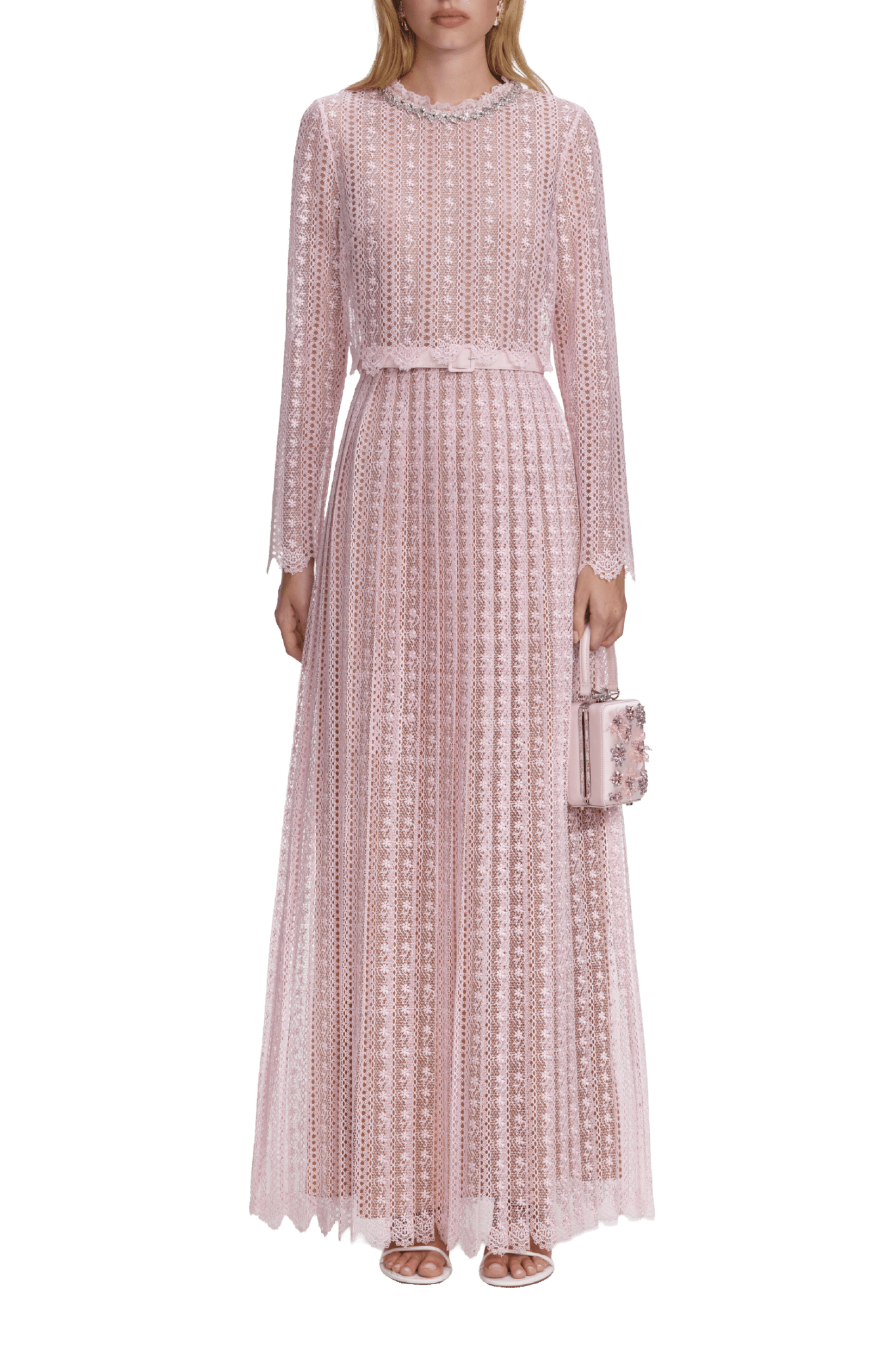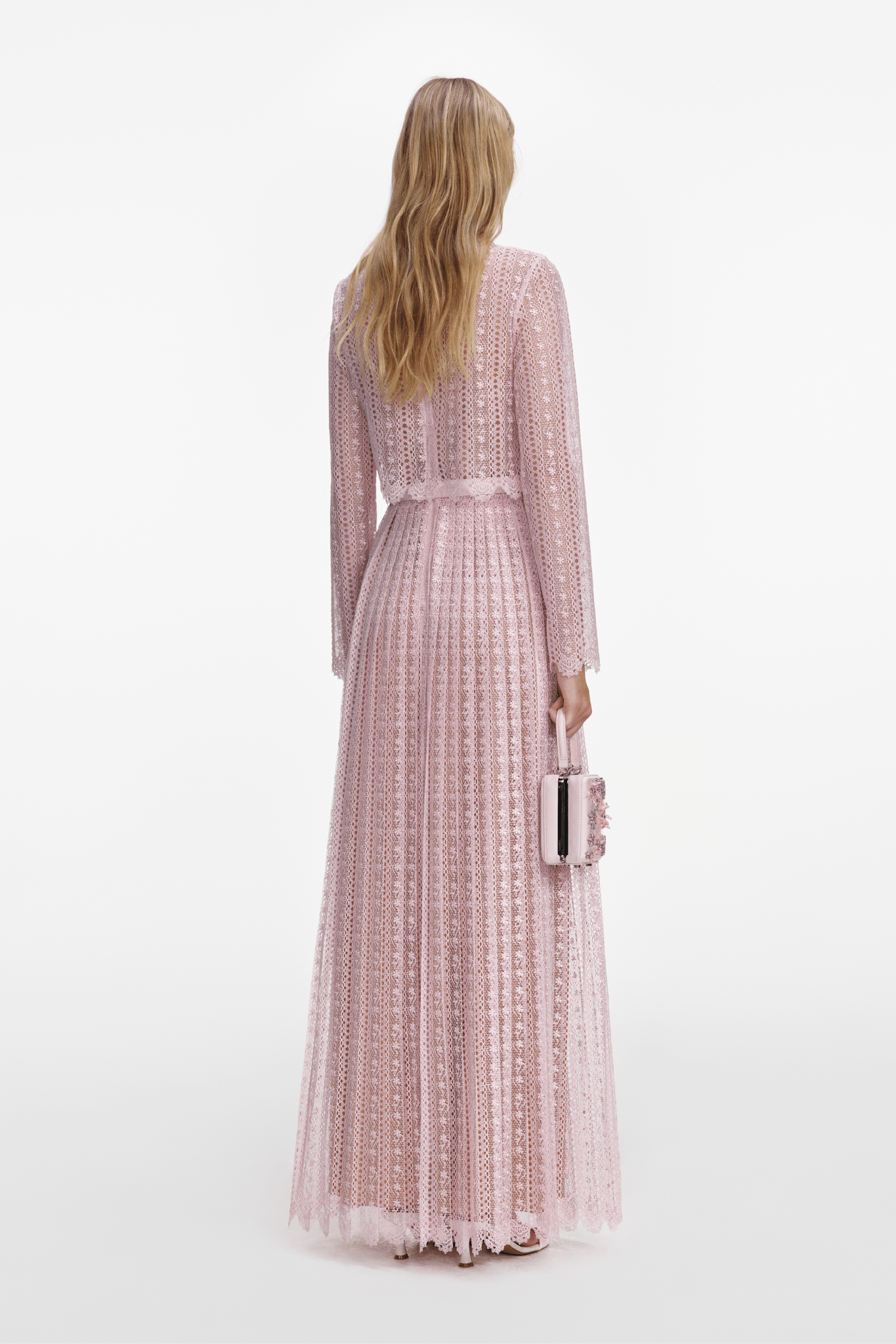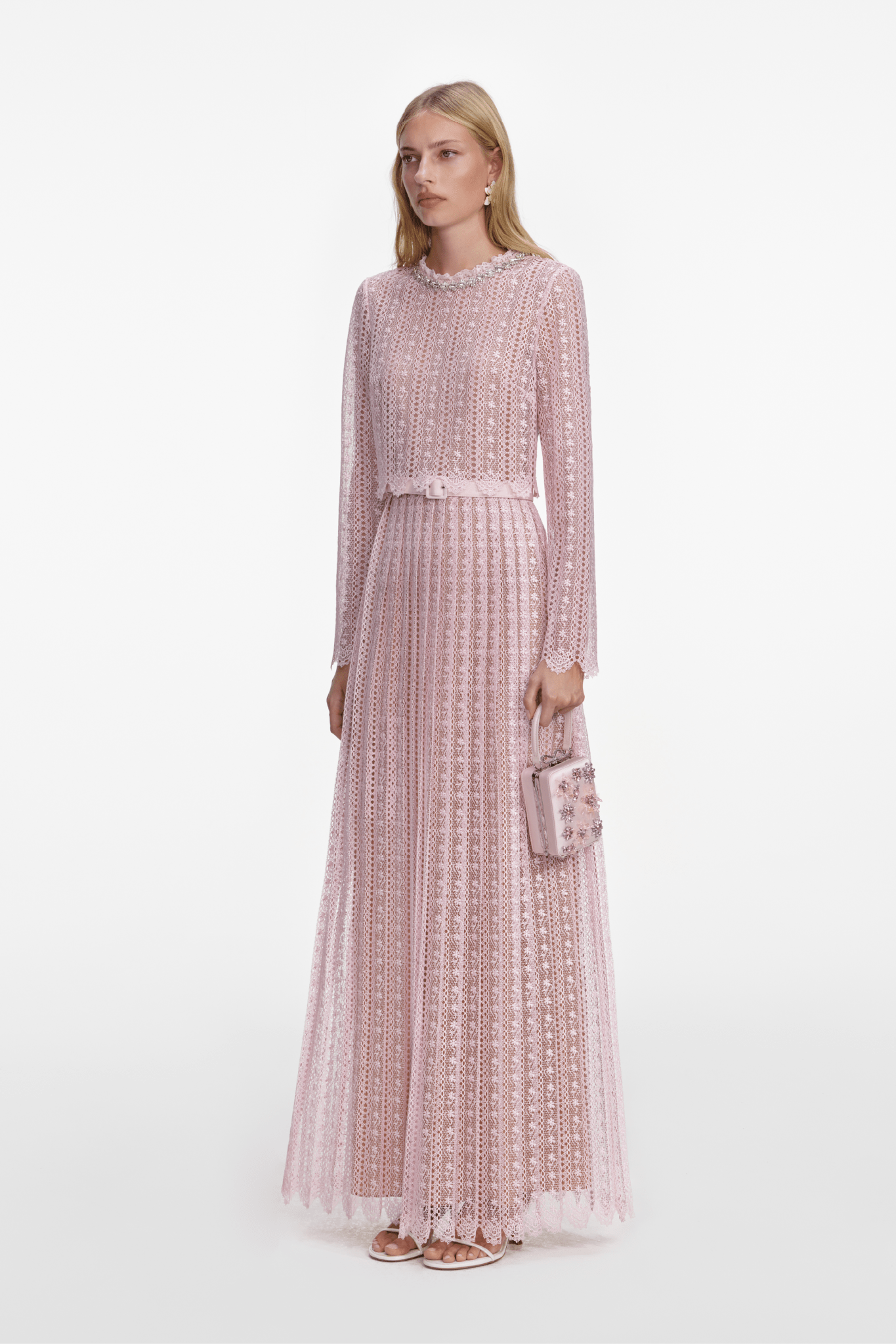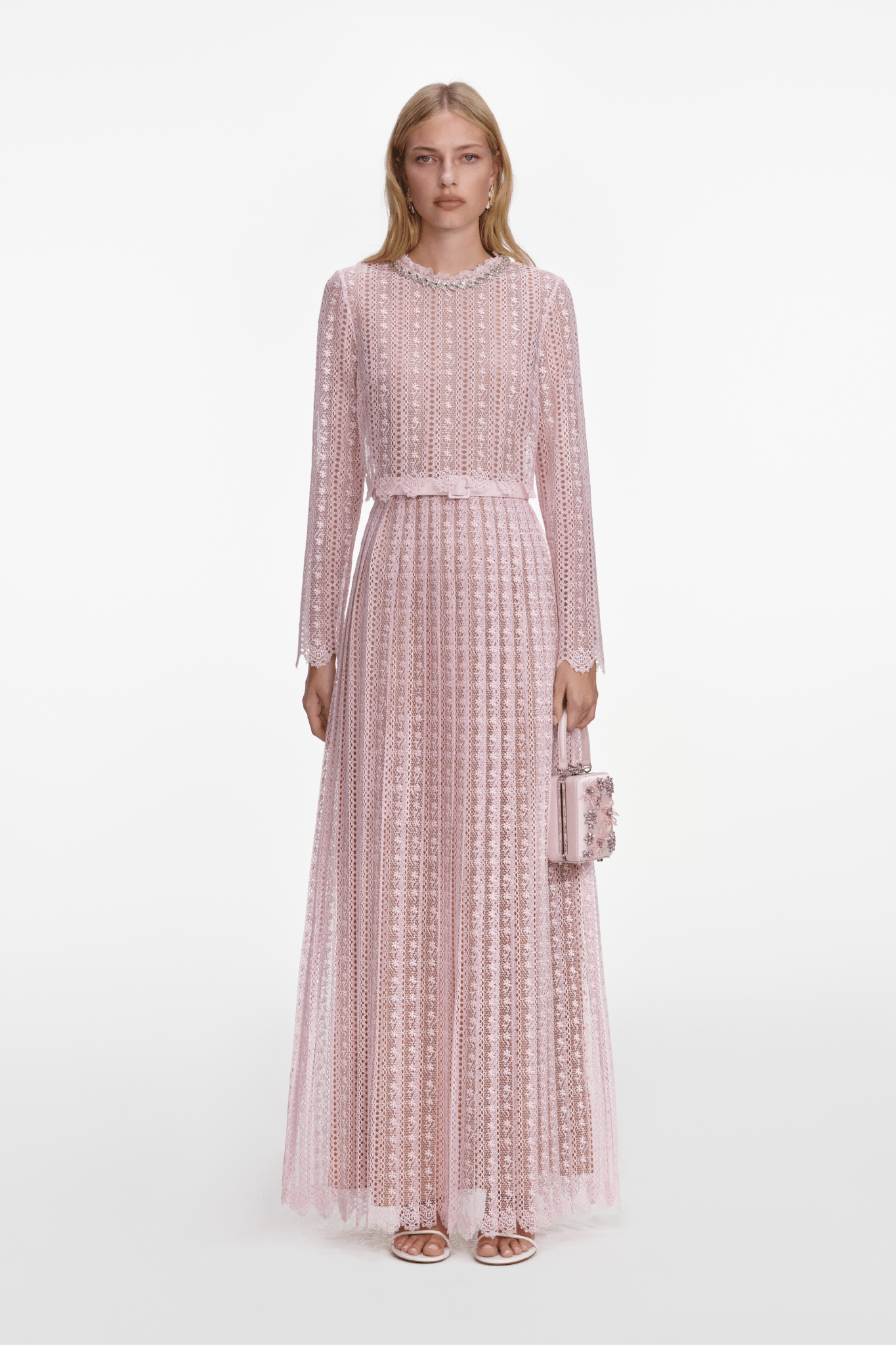 Delicate striped floral lace gives this pink maxi dress its ethereal appeal. Accessories come included with a tonal belt that cinches in the waist and diamanté trims that encircle the neckline.