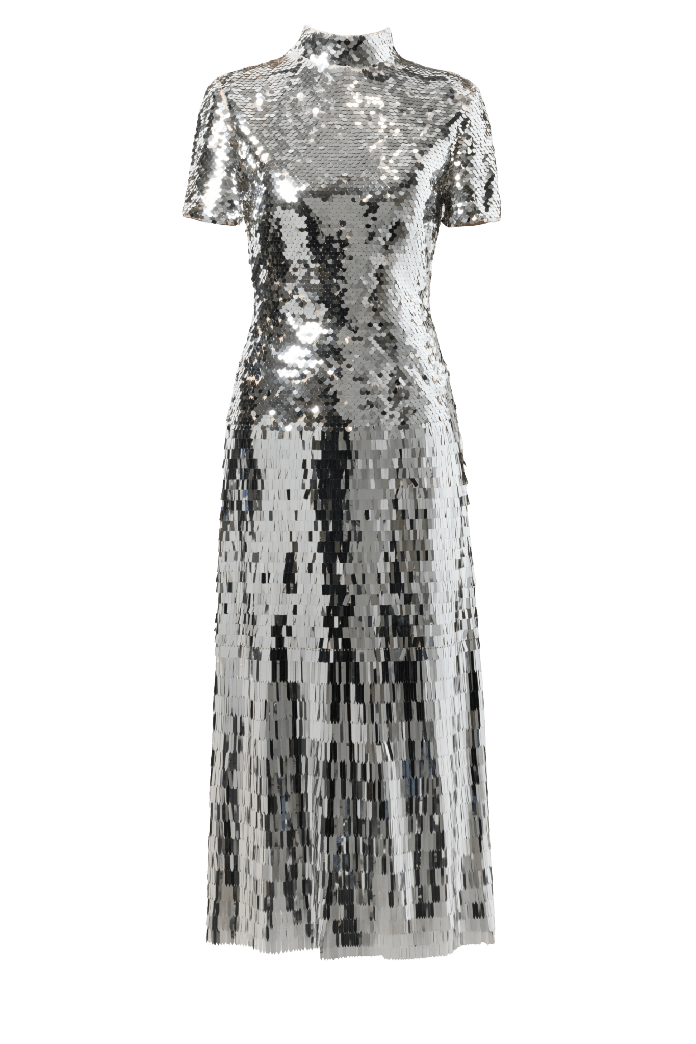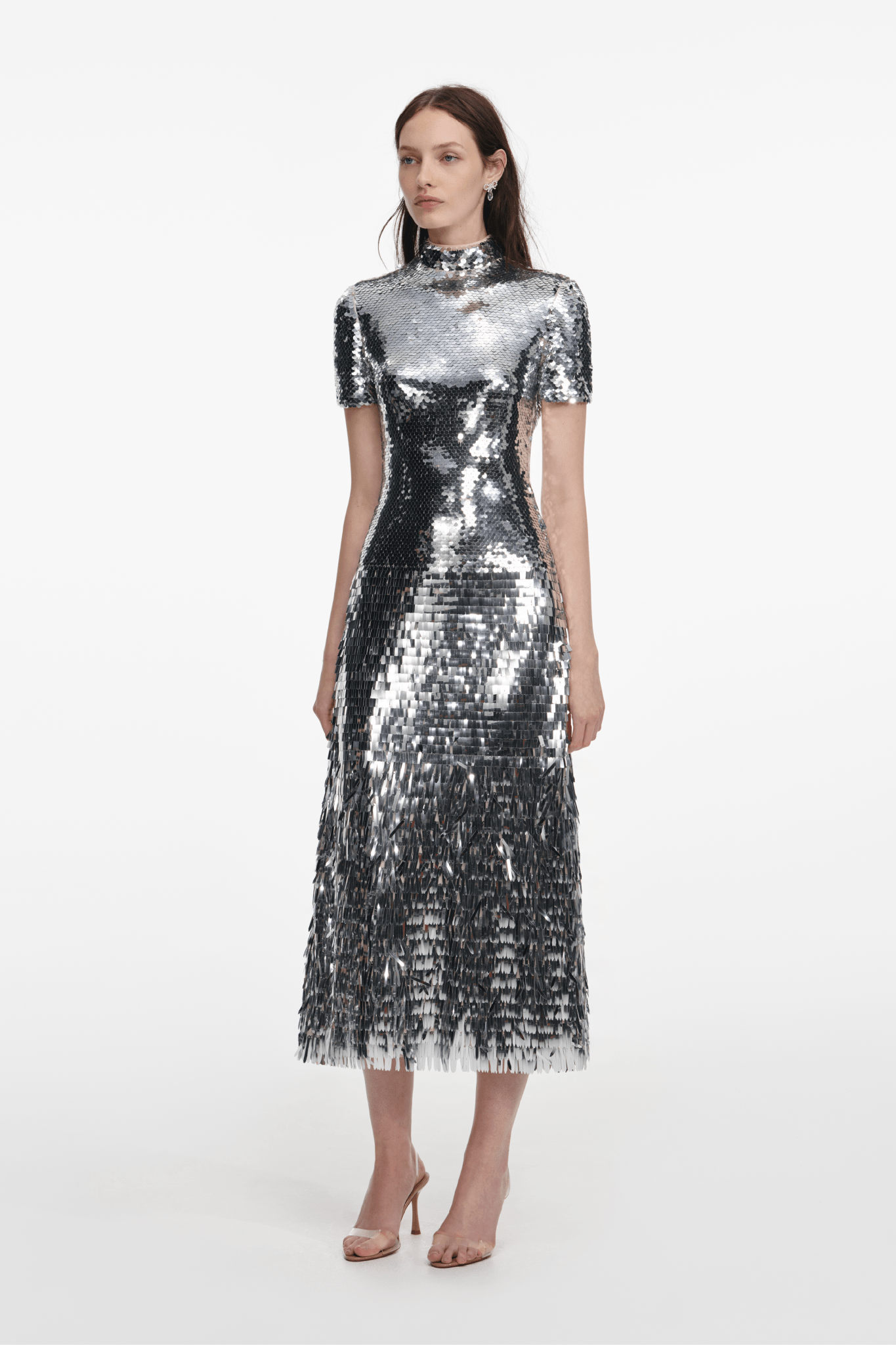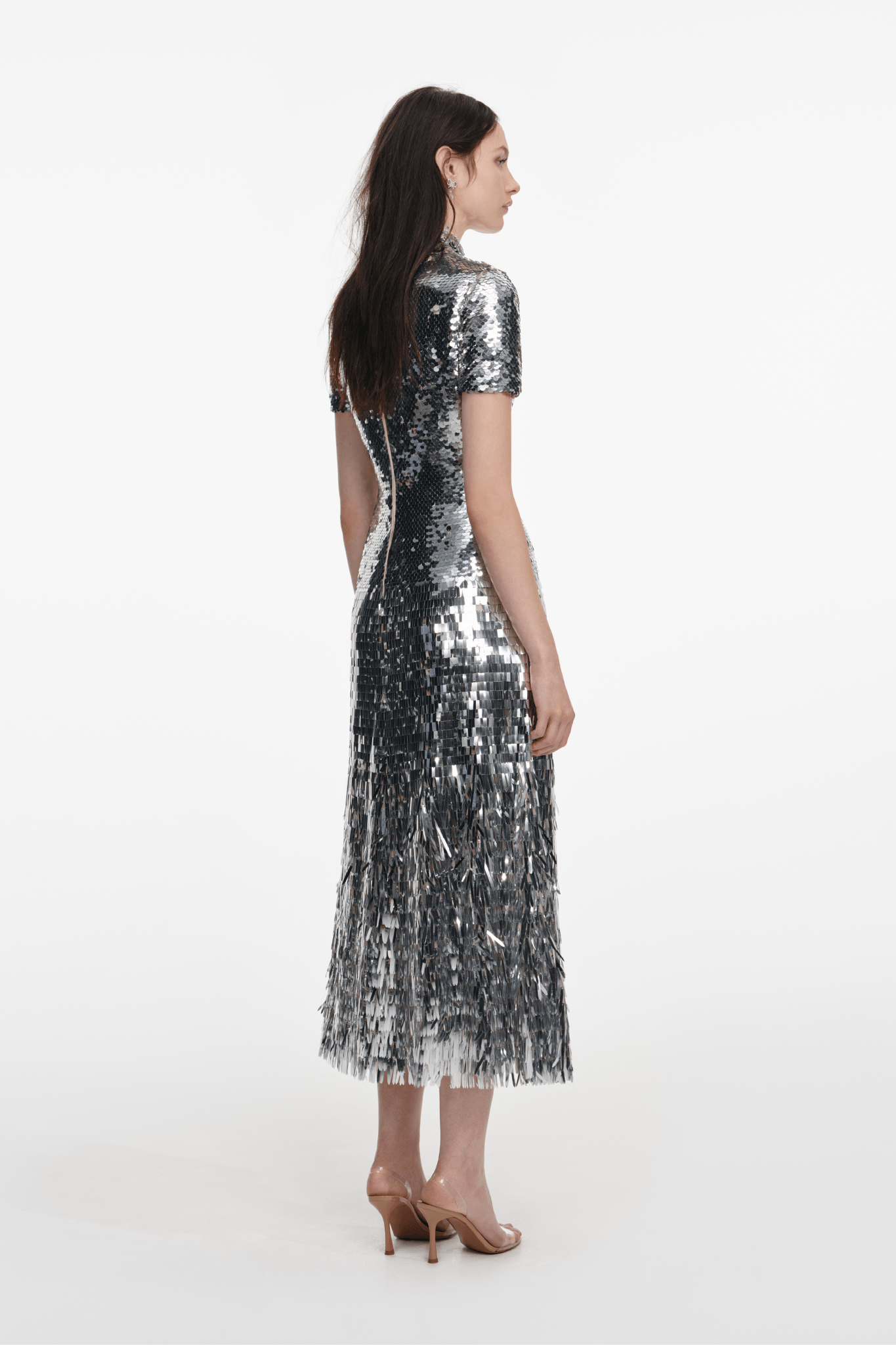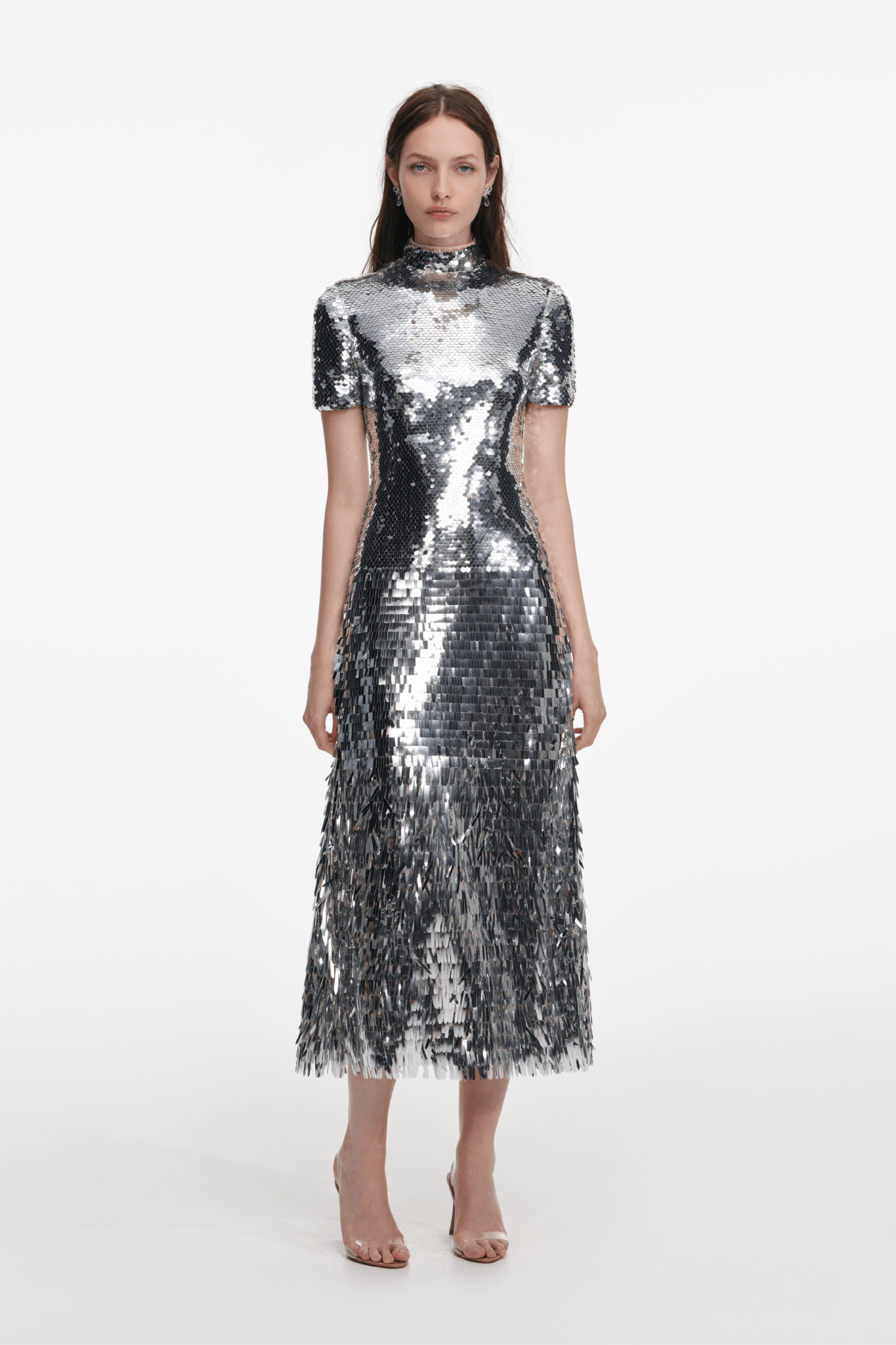 Not one to hold back, this silver sequin dress dazzles with its incandescent shine. Feather-like long sequins lend dynamic texture to its flowing midi skirt – add sky-high heels to up the ante.
