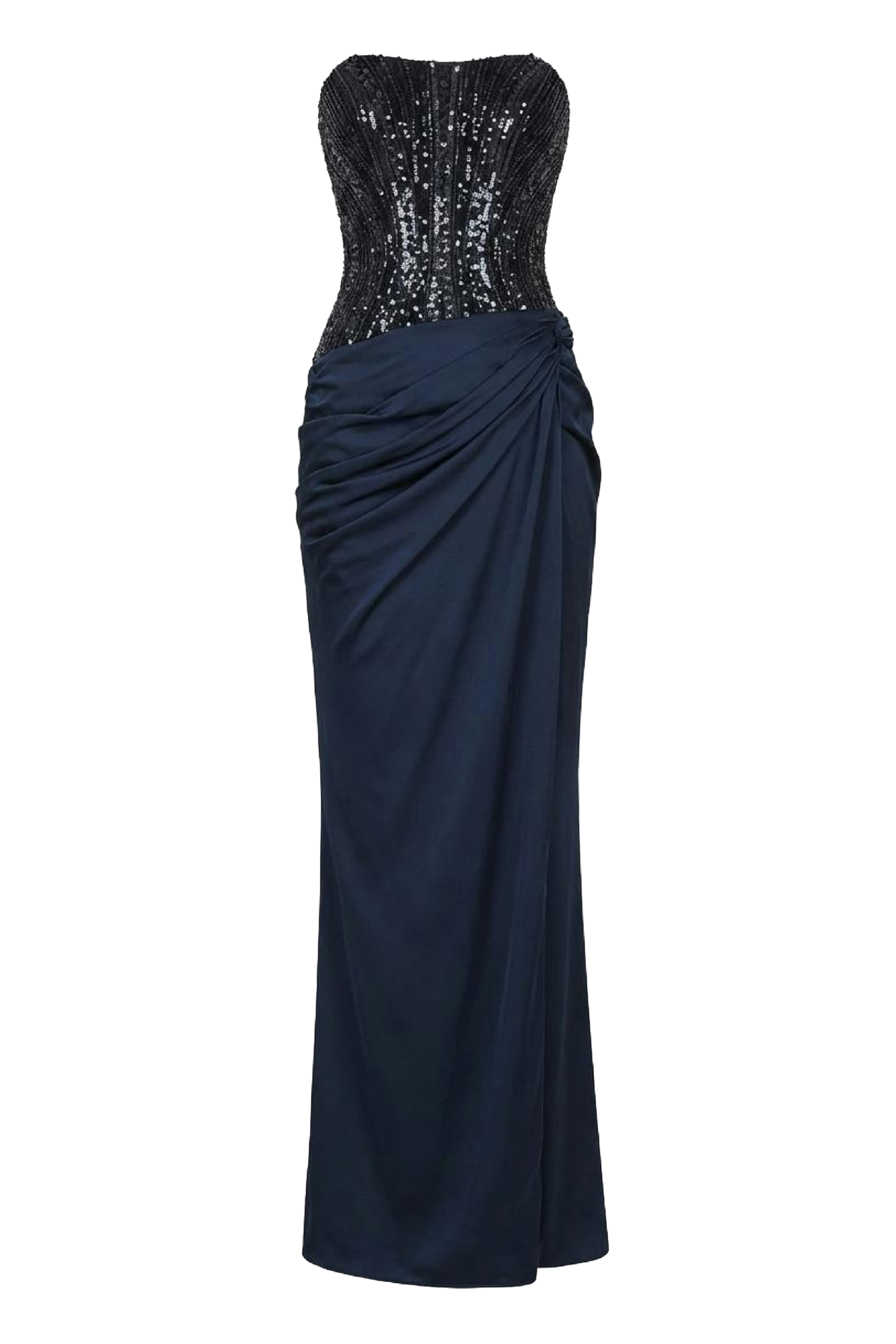 A strapless silhouette with a richly hand-beaded bodice and sleek skirt. The contrast of texture and simplicity creates a modern yet timeless evening look.
